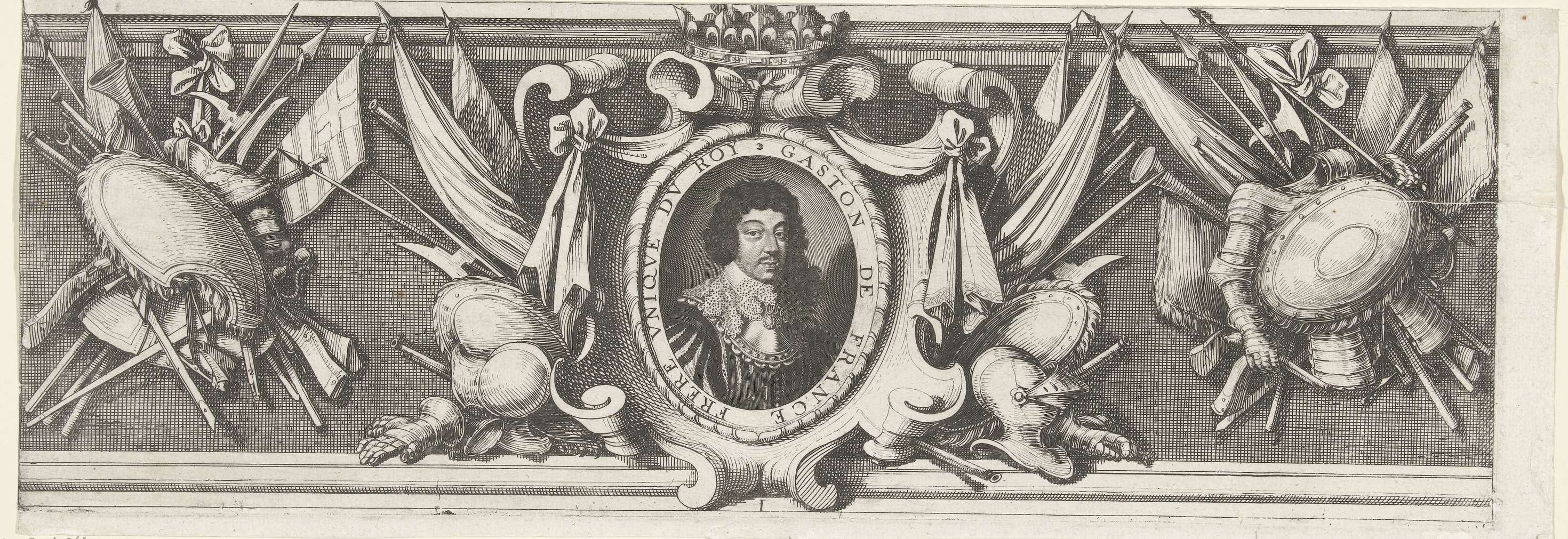 Zestiende deel (randwerk, deel middenonder) van een prent van het beleg van de citadel Saint Martin op het Île de Ré in 1627, dat werd uitgevoerd door Engelse troepen onder leiding van de hertog van Buckingham en werd beëindigd door Franse troepen onder leiding van kardinaal Richelieu. Op dit blad een portret van de broer ...