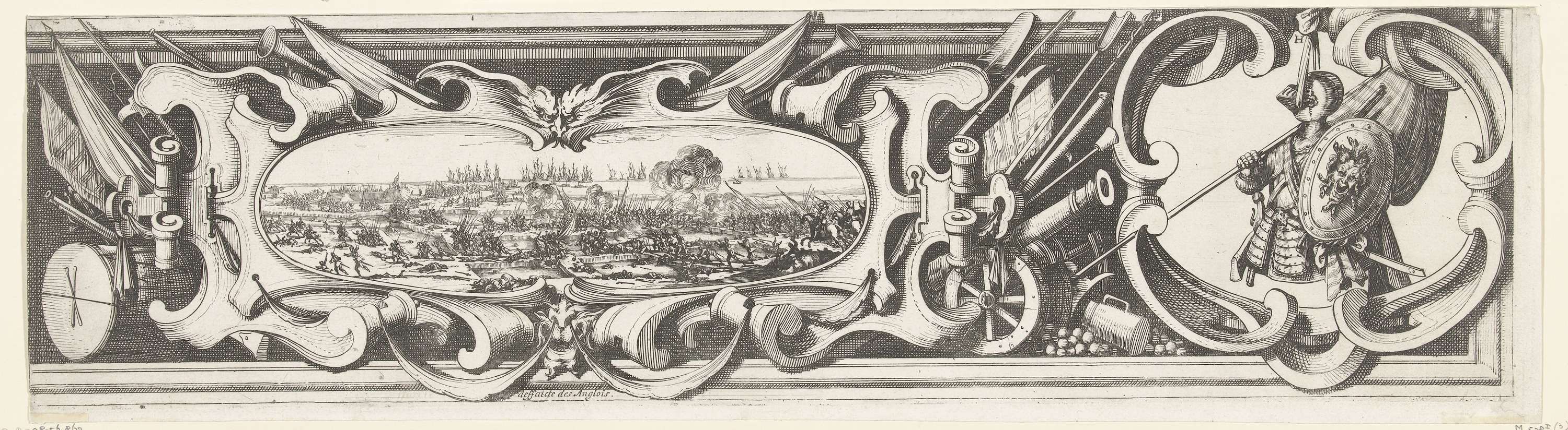 Zestiende deel (randwerk, deel rechtsonder) van een prent van het beleg van de citadel Saint Martin op het Île de Ré in 1627, dat werd uitgevoerd door Engelse troepen onder leiding van de hertog van Buckingham en werd beëindigd door Franse troepen onder leiding van kardinaal Richelieu. Op dit blad rechts een harnas en midden/links ...
