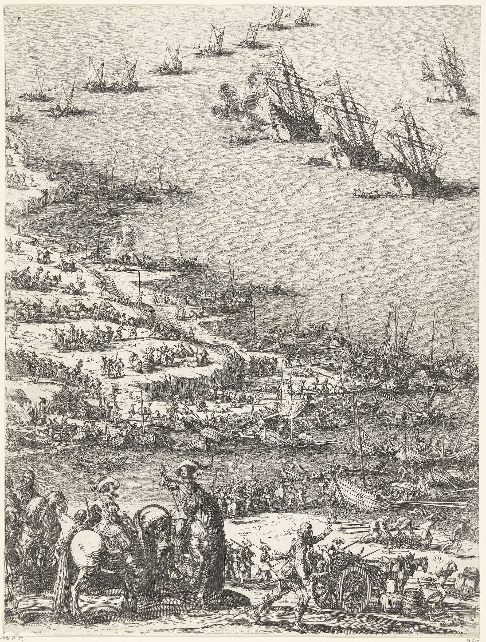 Zestiende deel (centrale kaart, deel linksonder) van een prent van het beleg van de citadel Saint Martin op het Île de Ré in 1627, dat werd uitgevoerd door Engelse troepen onder leiding van de hertog van Buckingham en werd beëindigd door Franse troepen onder leiding van kardinaal Richelieu. Op dit blad op de voorgrond links ...
