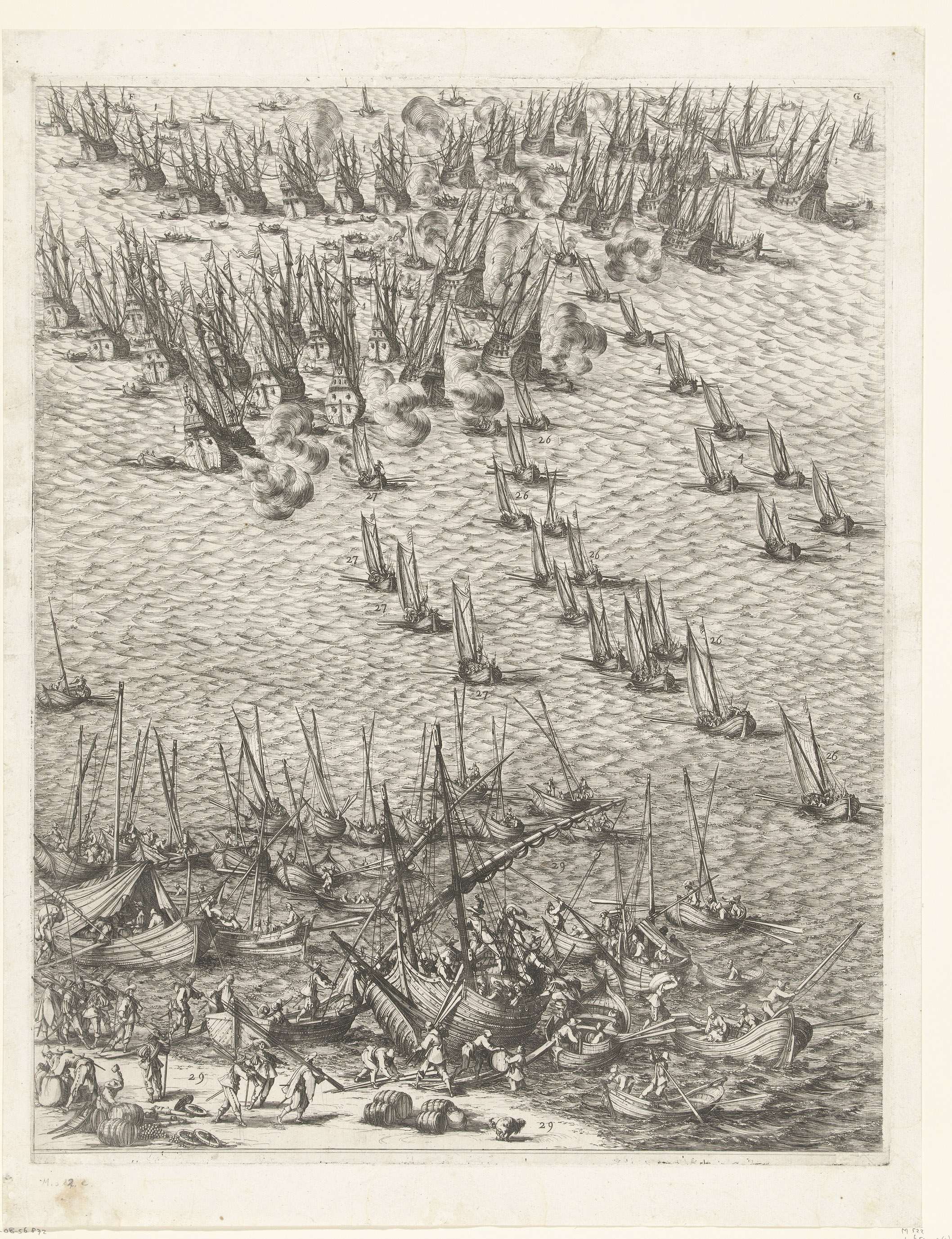 Zestiende deel (centrale kaart, deel middenonder) van een prent van het beleg van de citadel Saint Martin op het Île de Ré in 1627, dat werd uitgevoerd door Engelse troepen onder leiding van de hertog van Buckingham en werd beëindigd door Franse troepen onder leiding van kardinaal Richelieu. Op dit blad op de voorgrond de ...