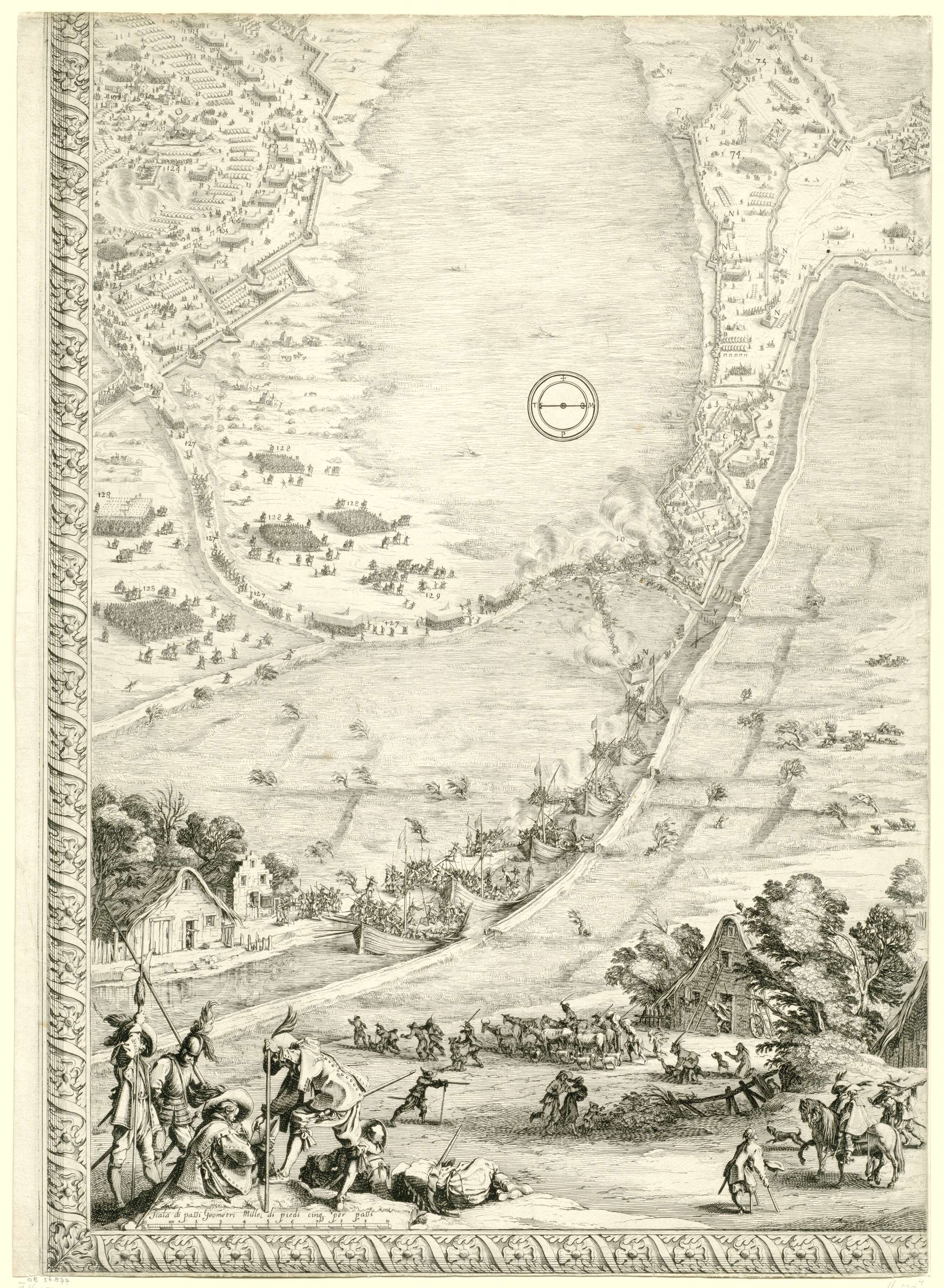 Zesde deel (linksonder) van een voorstelling van het beleg van de stad Breda in de jaren 1624 en 1625 door de Spanjaarden onder aanvoering van Ambrogio Spinola. Op dit blad een deel van de belegeringswerken en kampementen om Breda. Voorts op de voorgrond een (deel van een) dorpje dat door soldaten geplunderd wordt, en helemaal ...