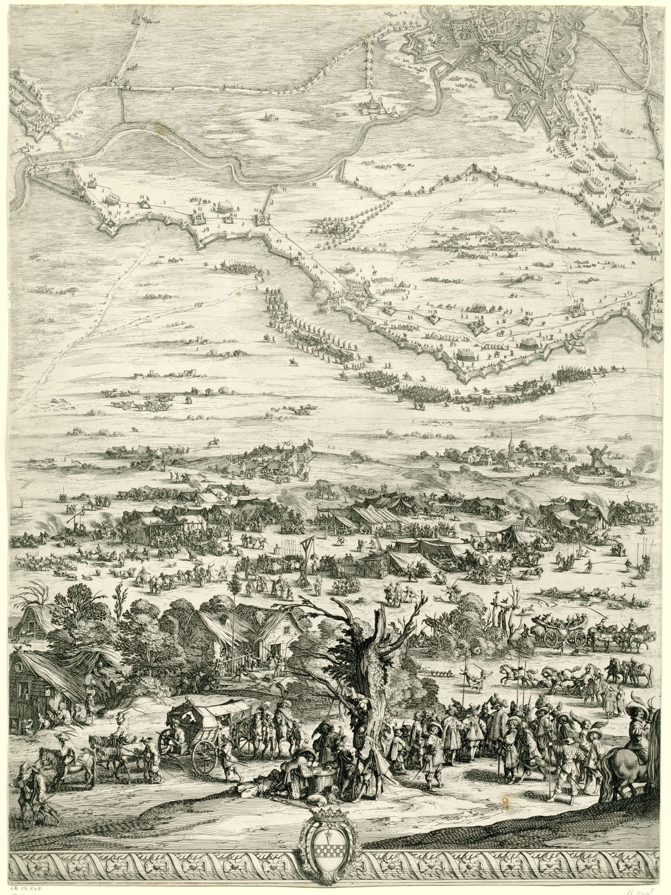 Zesde deel (middenonder) van een voorstelling van het beleg van de stad Breda in de jaren 1624 en 1625 door de Spanjaarden onder aanvoering van Ambrogio Spinola. Op dit blad een deel van de belegeringswerken en kampementen om Breda, en een deel van de stad zelf. Voorts op het middenplan, recht onder Breda, een tentenkamp ...