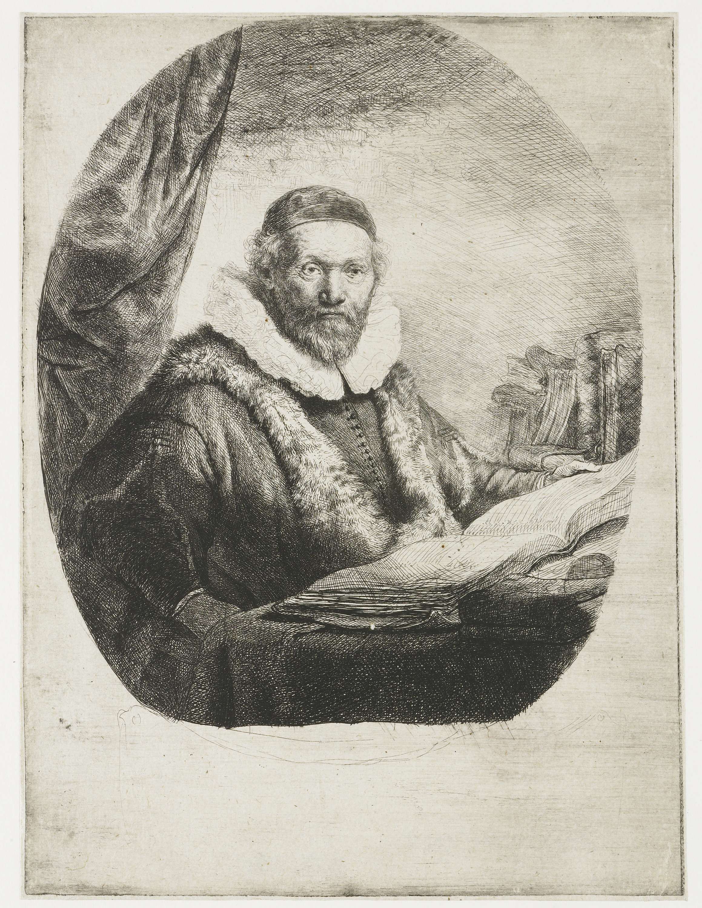 Nadat Wtenbogaert in 1629 uit ballingschap terugkeerde, heeft Rembrandt hem twee keer geportretteerd. Eerst in 1633 in een schilderij, twee jaar later in deze ets waarin Wtenbogaert als een geleerde opkijkt van zijn werk. Het gedichtje van Hugo de Groot (Grotius) verwijst hiernaar en onderstreept dat hij ondanks de ondergane vernederingen een ongebroken man bleef. ...