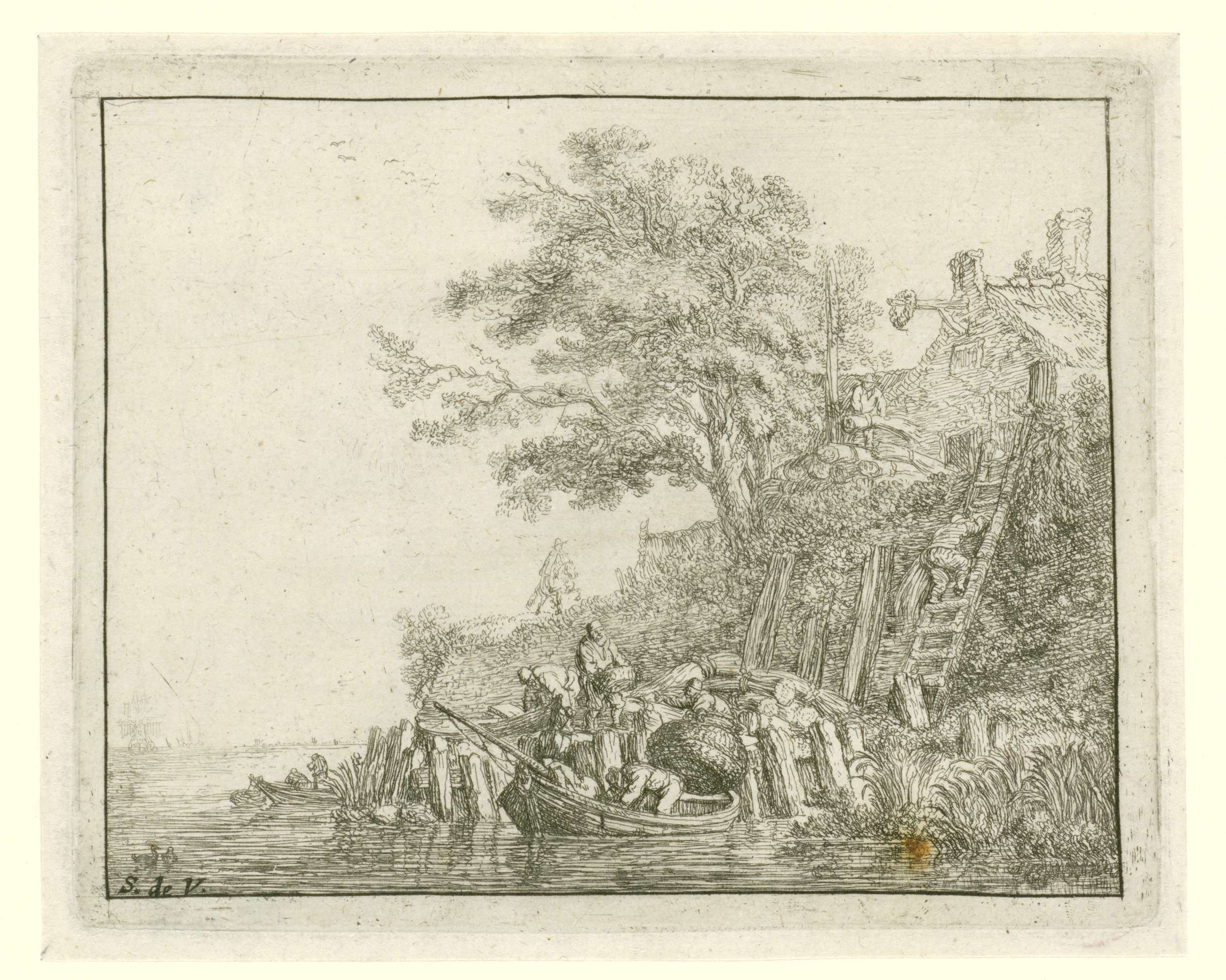 Boerderij aan het water met stapel graanschoven. Mannen laden graanschoven en manden in een boot.
