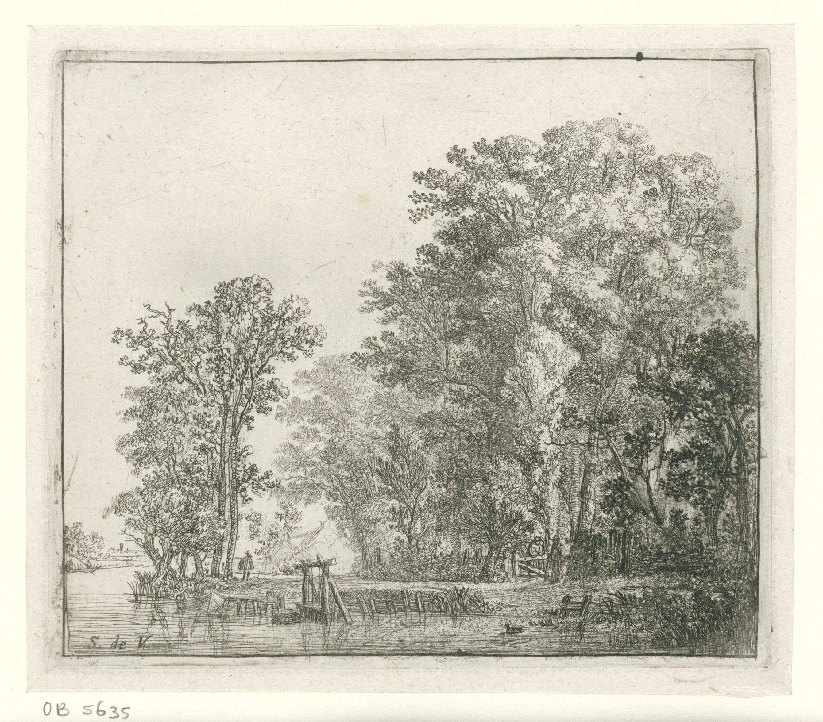 Kanaal met bomen op de oever, een wandelaar en twee mensen bij een hek.