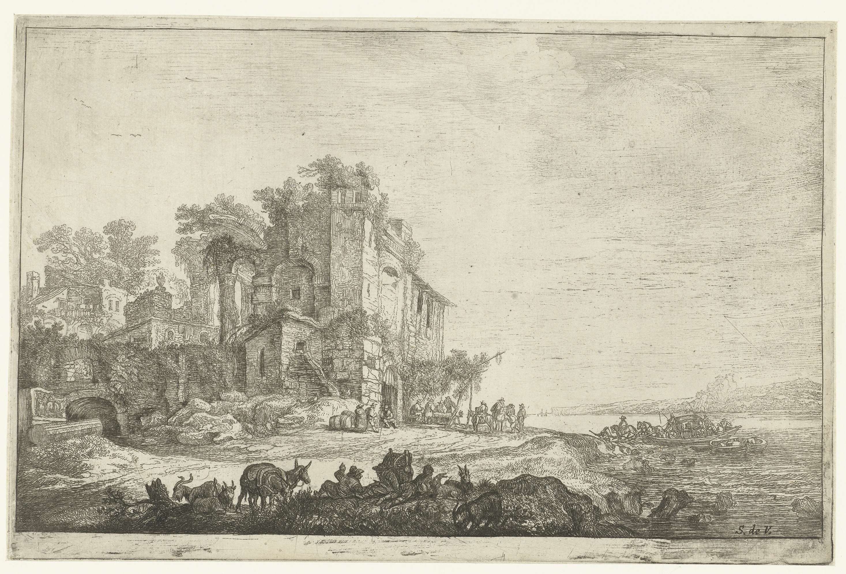 Een antiek ruïne waarin een herberg is gevestigd aan de oever van een brede rivier. Een veerpond met koets en paarden meert aan. Vóór de herberg een aantal gasten, op de voorgrond herders met geiten, een reiziger en twee pakezels.