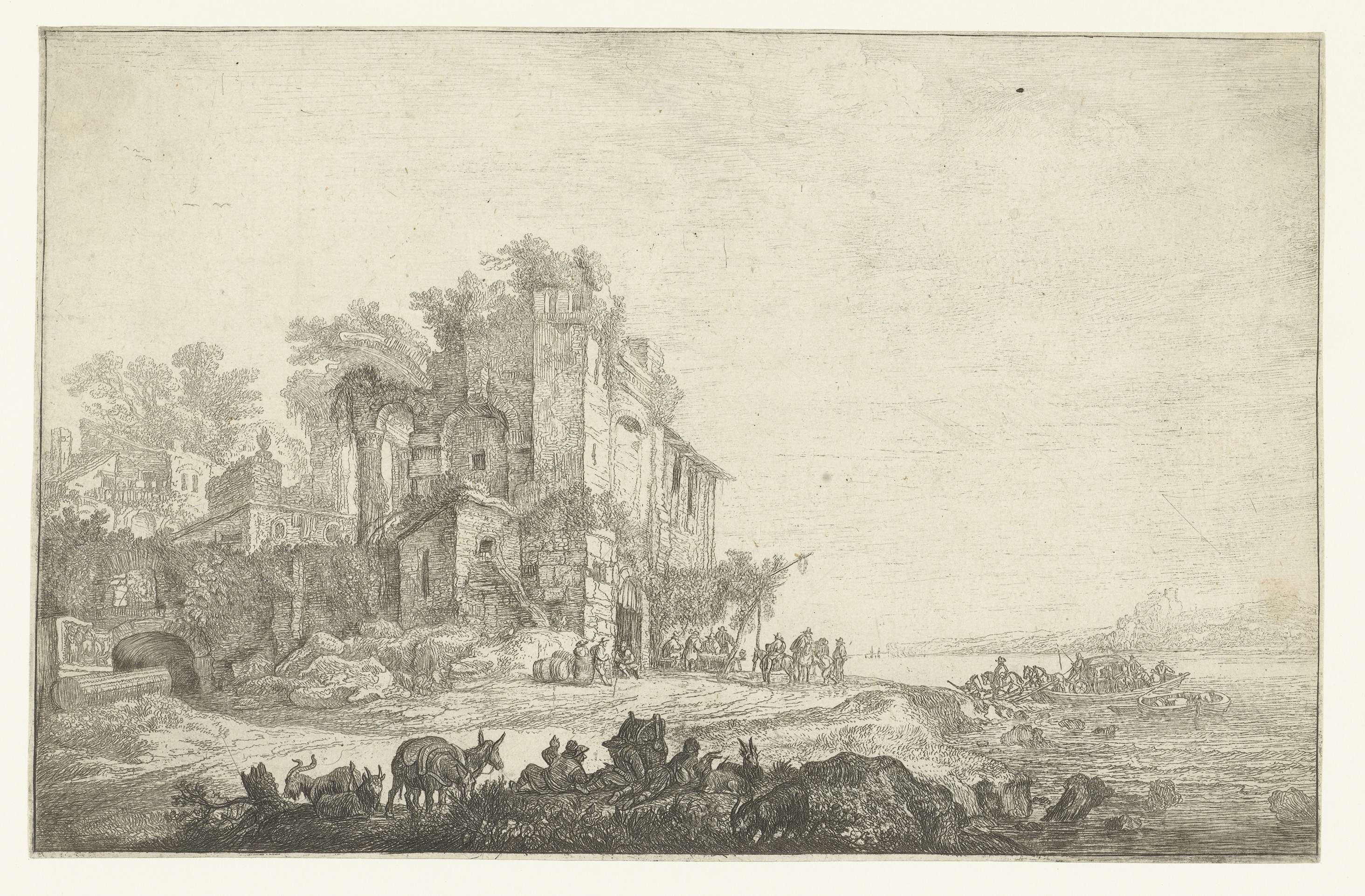 Een antiek ruïne waarin een herberg is gevestigd aan de oever van een brede rivier. Een veerpond met koets en paarden meert aan. Vóór de herberg een aantal gasten, op de voorgrond herders met geiten, een reiziger en twee pakezels.