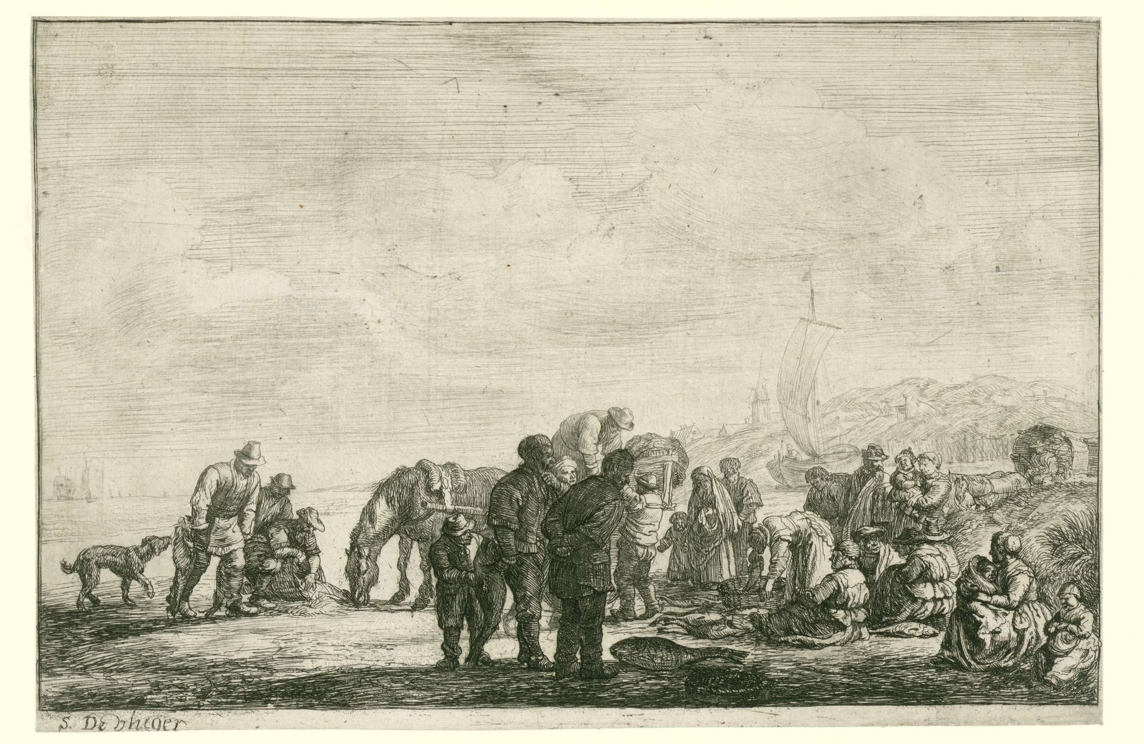 Groep van mannen, vrouwen en kinderen op het strand met vismanden en twee karren getrokken door paarden. Achter de duinen een dorp.