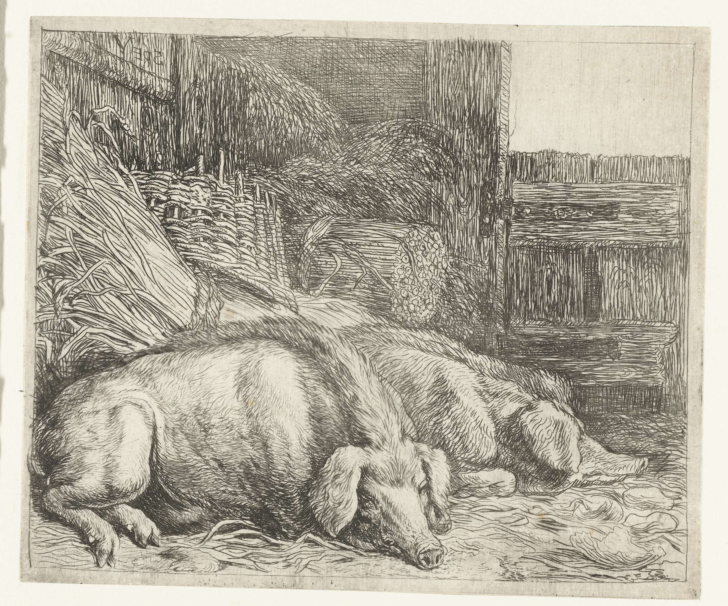 Uit een serie van tien prenten. Twee slapende varkens in een stal met stro.