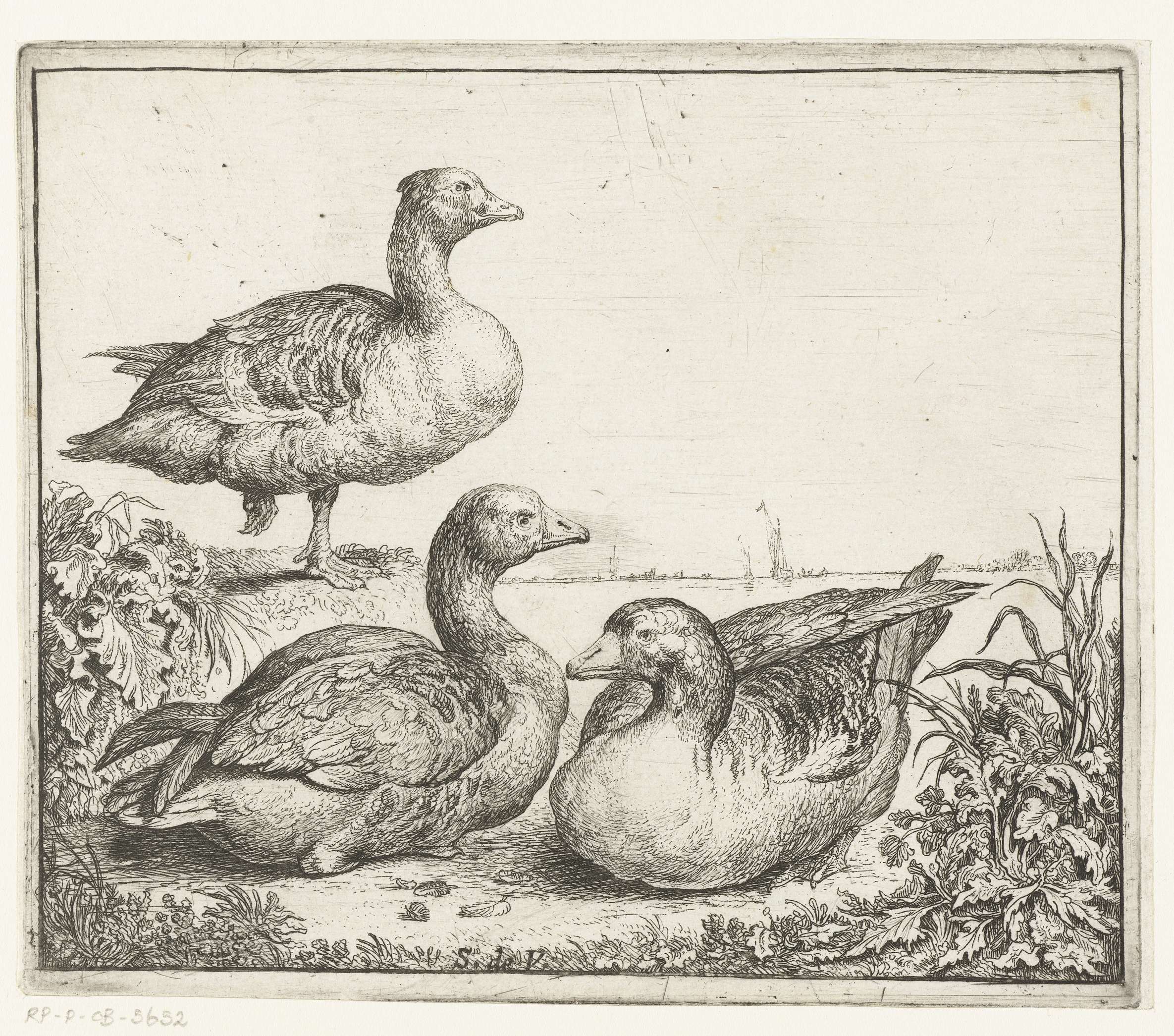 Uit een serie van tien prenten. Drie ganzen op de oever bij een meer.