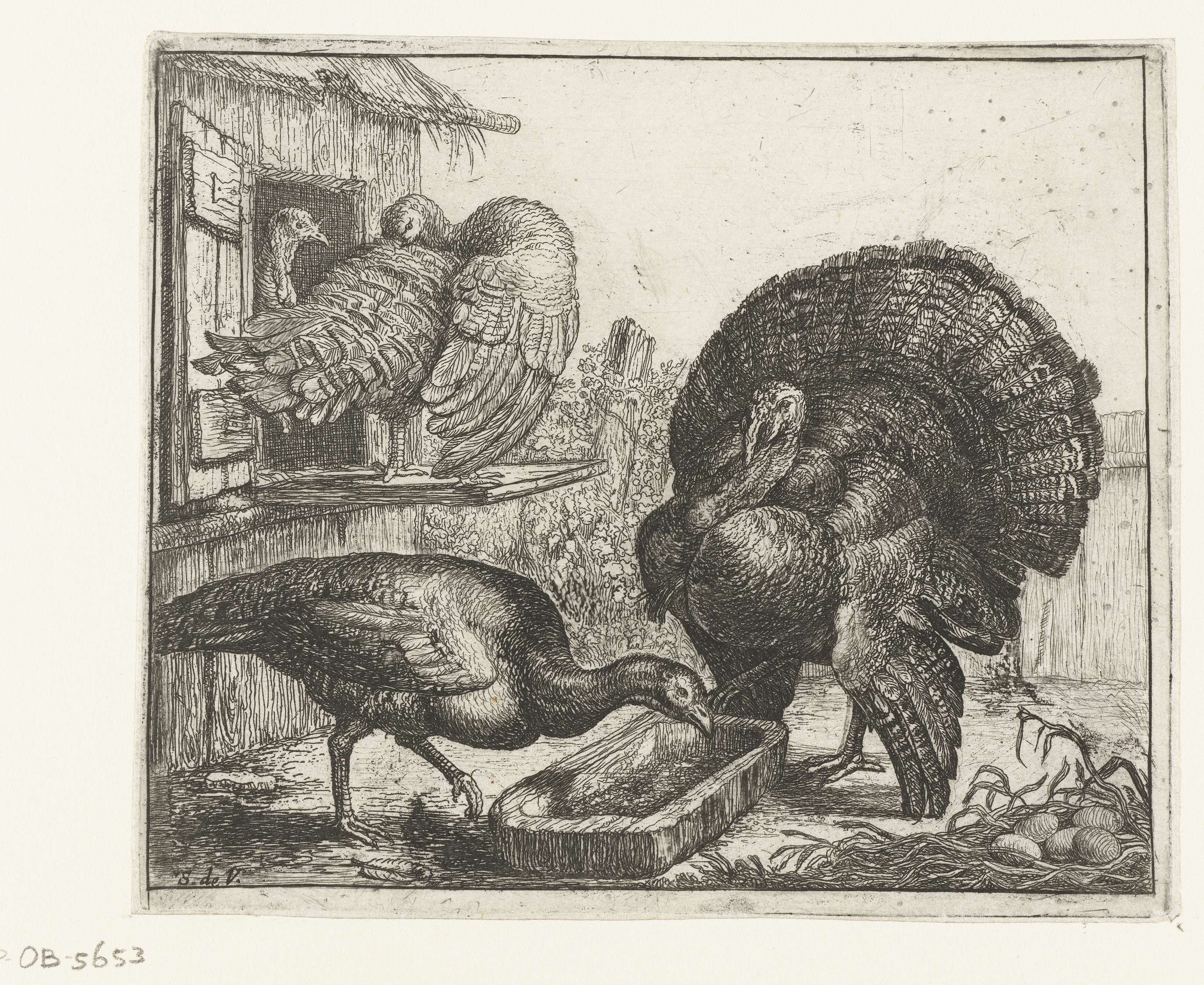 Uit een serie van tien prenten. Vier kalkoenen bij een voedervak en een hok, en een nest met eieren.