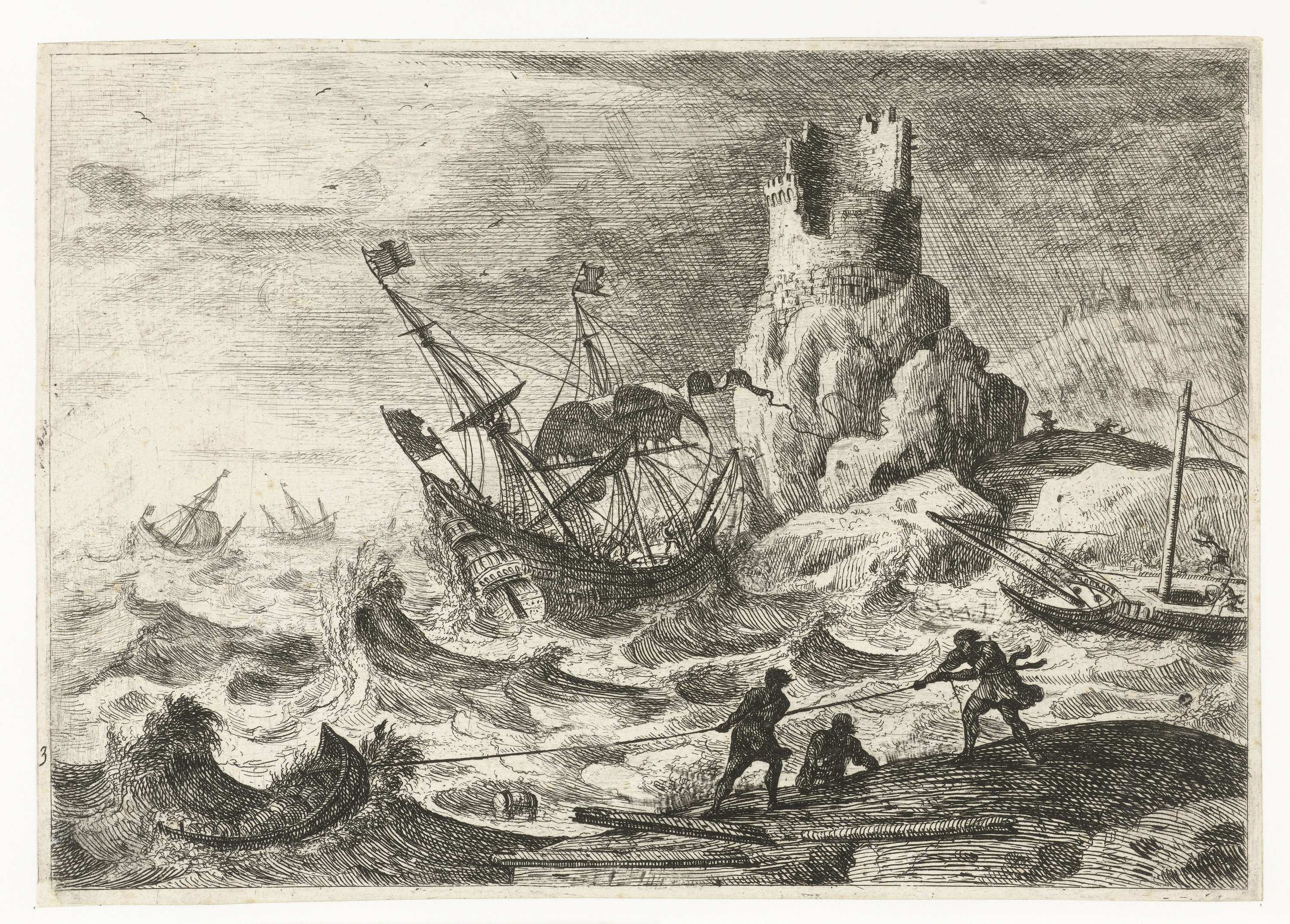 Drie schepen lijden schipbreuk op een stormachtige zee vlakbij de kust. Drie mannen op de romp van een omgeslagen schip, trekken met een touw een sloep naar zich toe.