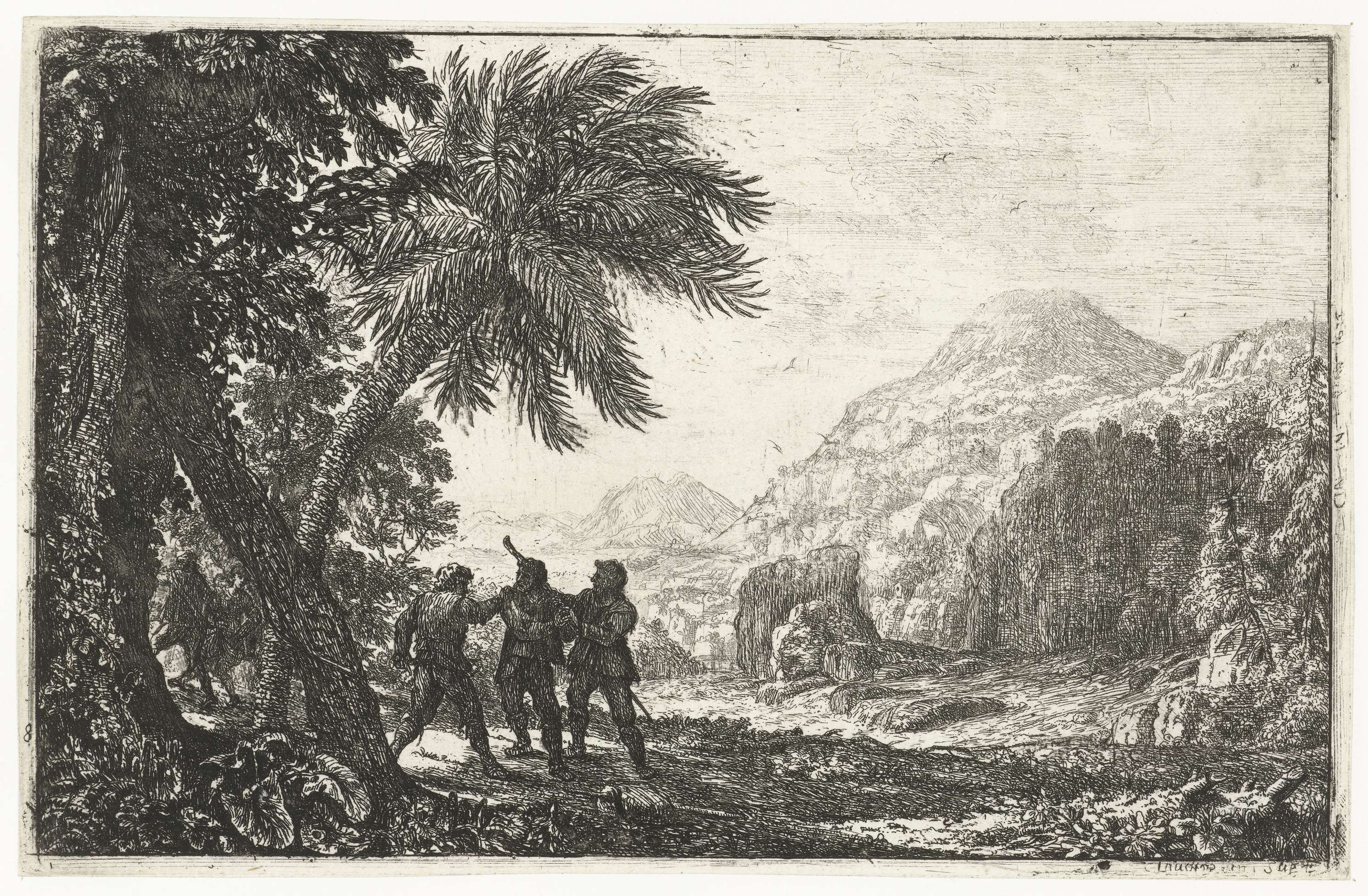 Twee struikrovers overvallen een man bij een bosrand, in een bergachtig landschap.