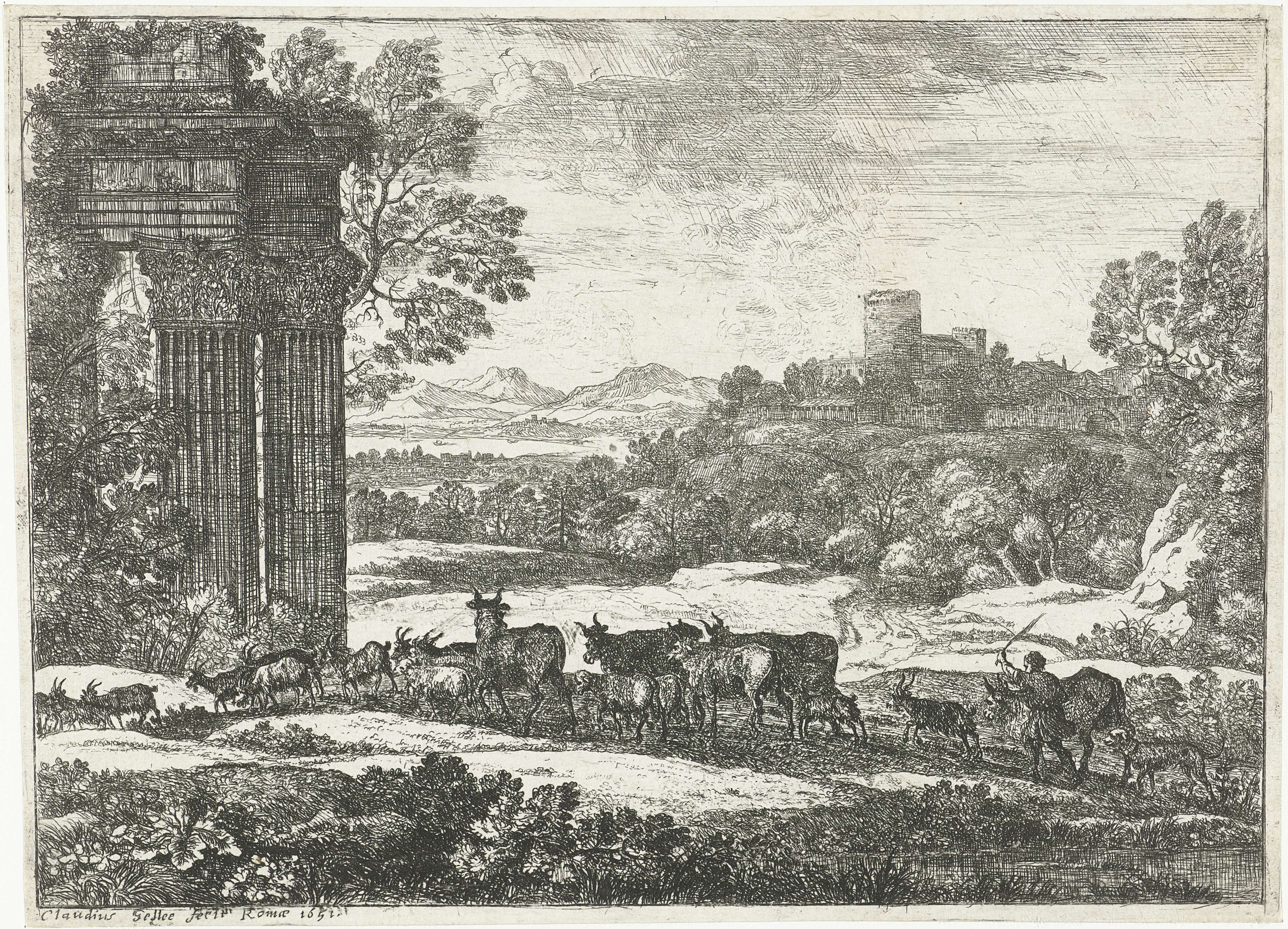 Een herder drijft zijn kudde van koeien, schapen en geiten door een landschap met een ruïne. Regen valt uit donkere wolken.