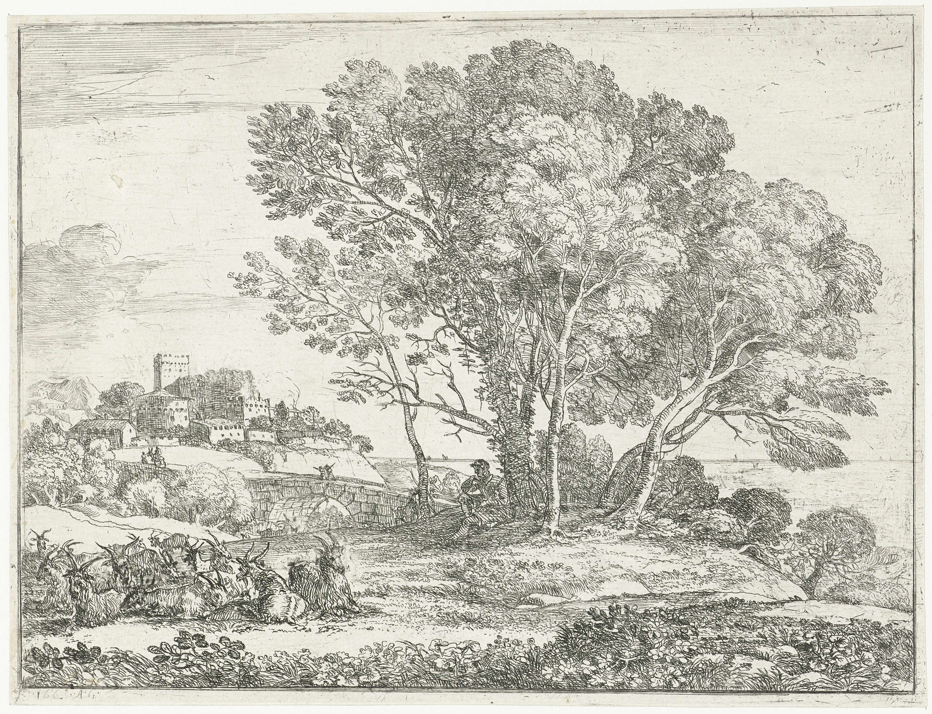 Landschap met een kudde geiten liggend op het gras en een geitenhoeder zittend onder een boom.