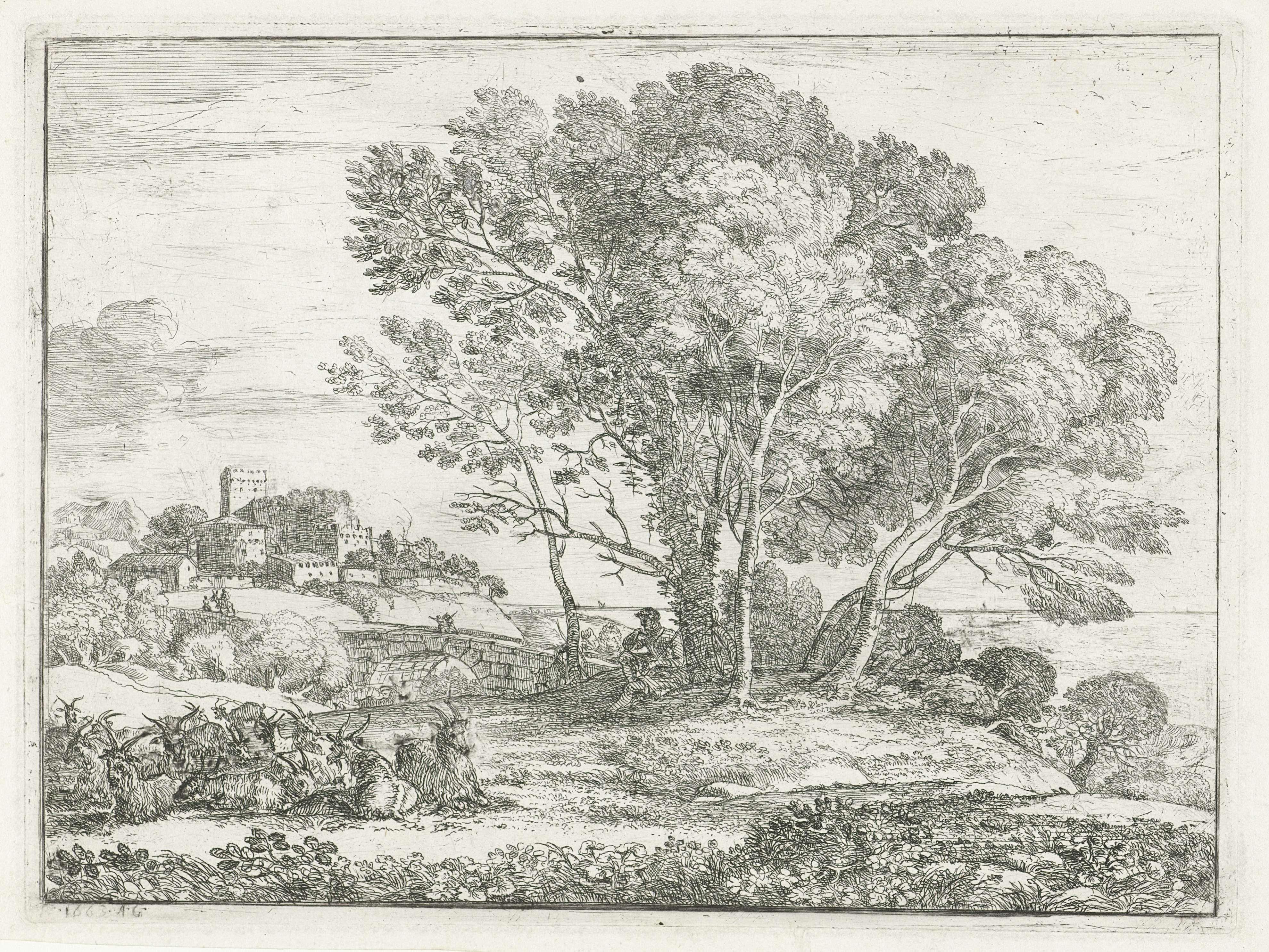 Landschap met een kudde geiten liggend op het gras en een geitenhoeder zittend onder een boom.