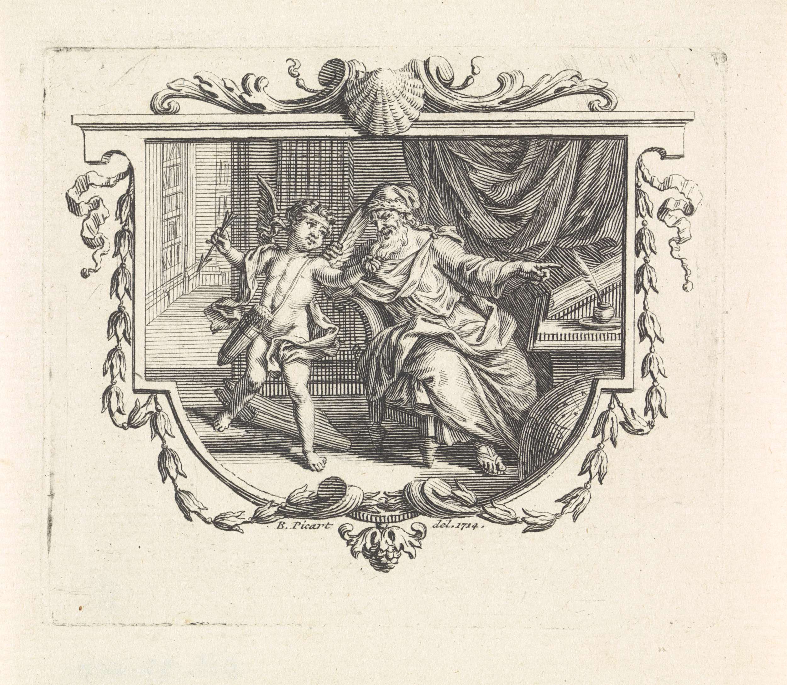 Amor trekt aan een oude man zijn baard. De man wijst op zijn lessenaar. Bovenaan de ornamentele lijst een schelp.