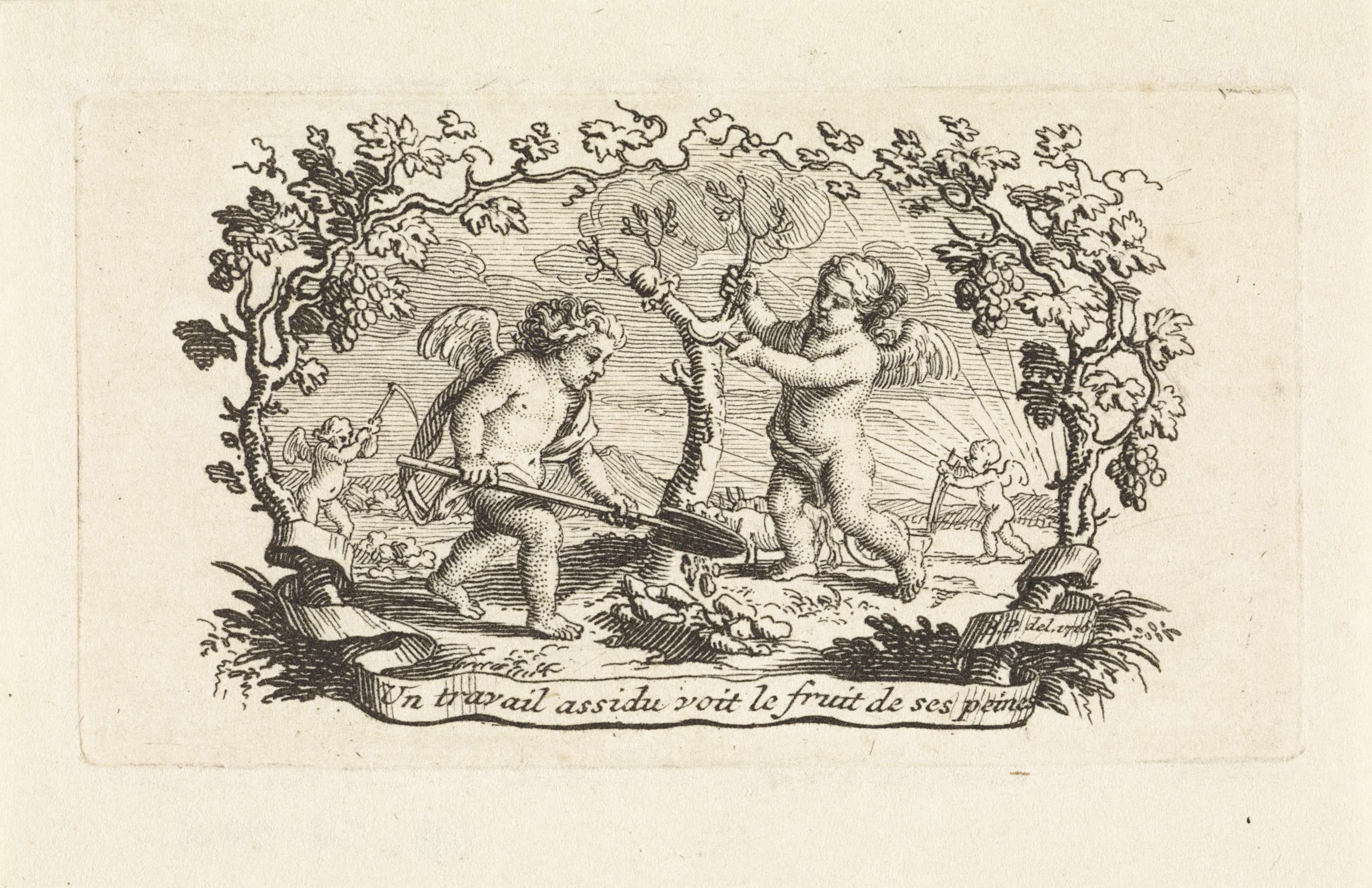 Putti bewerken het land en een van hen snoeit een boom. Onderaan het devies: Un travail assidu voit la fruit de ses peines.
