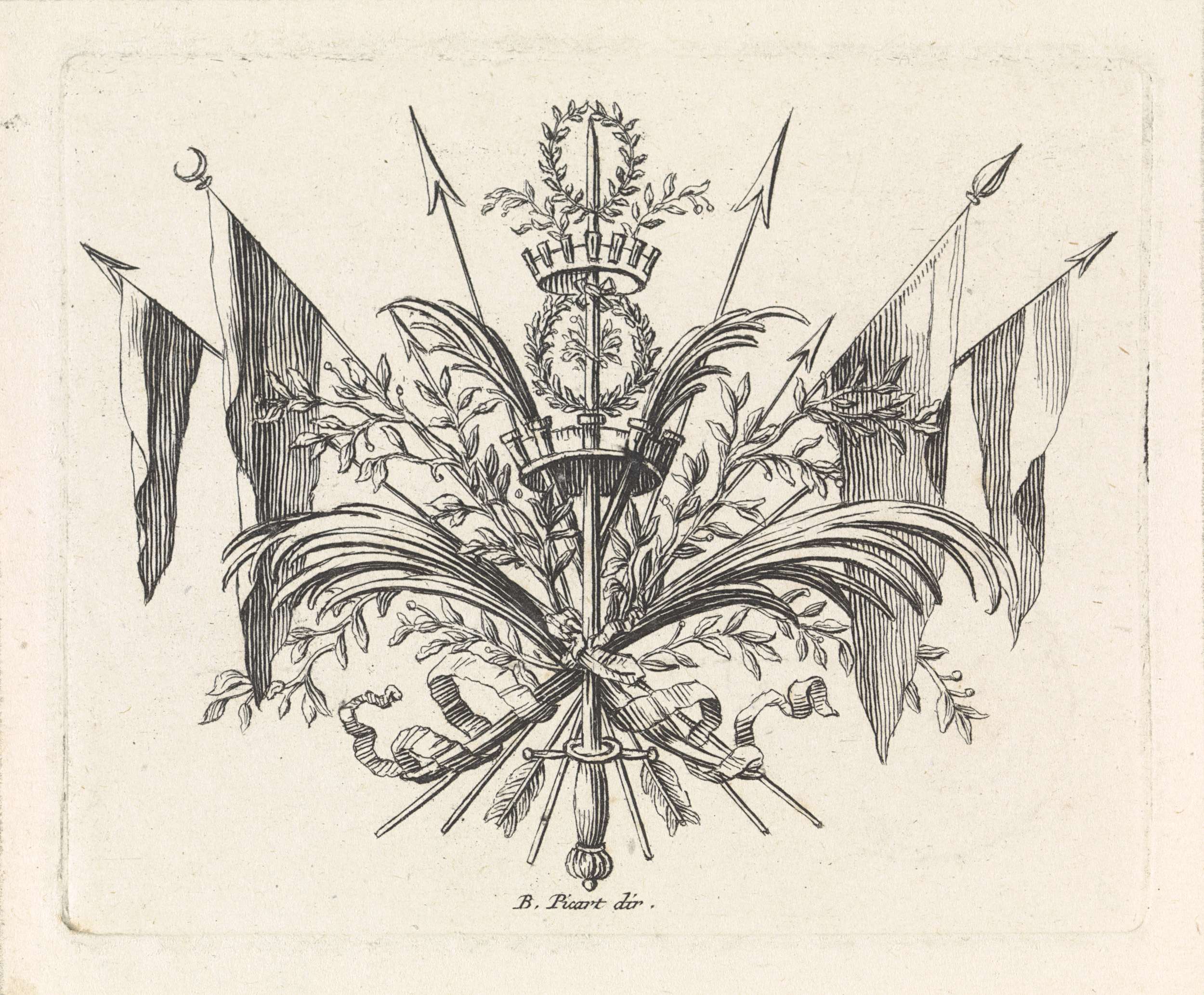 Een zwaard met kroon, gebundeld met palmtakken, speren en banieren.