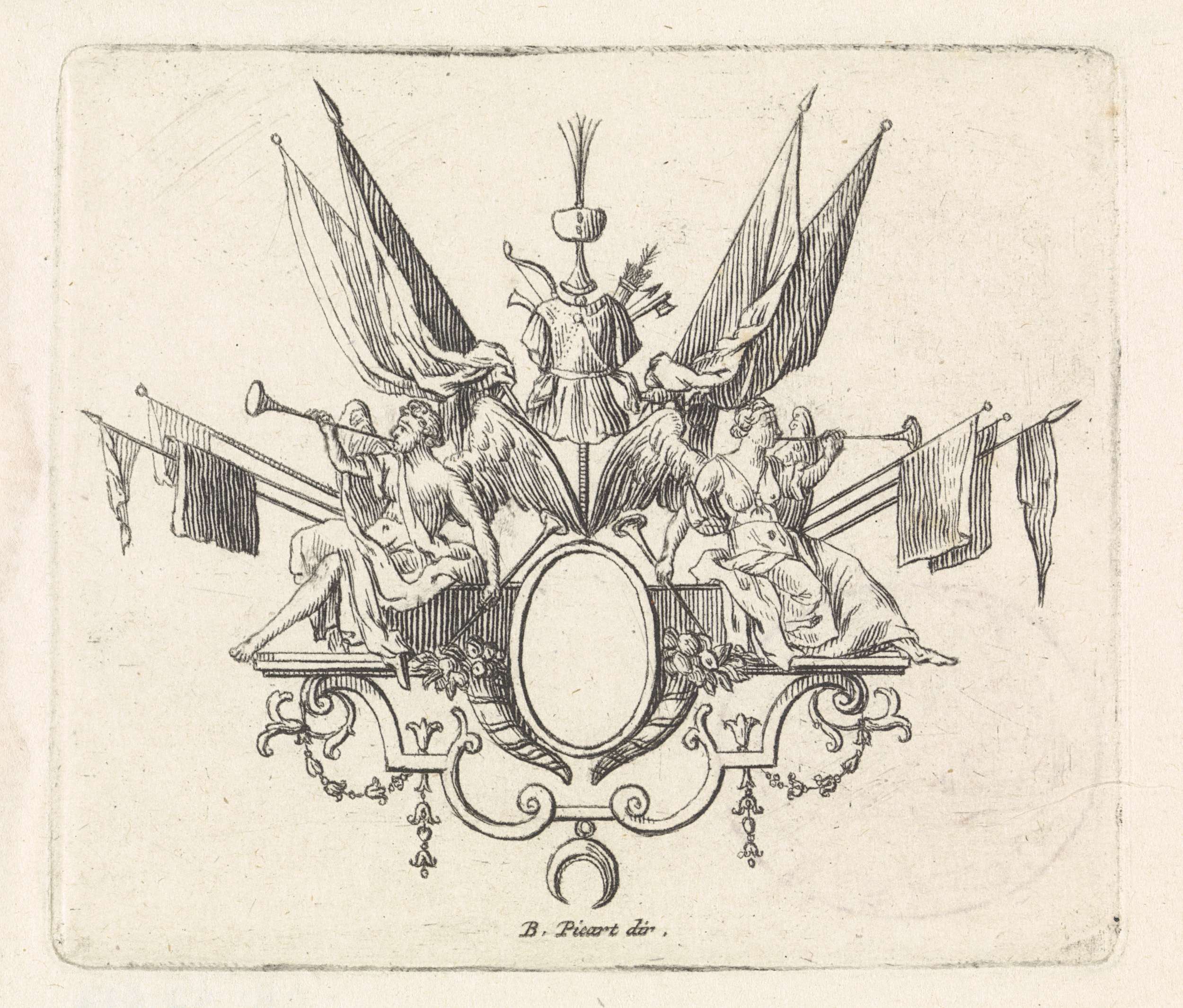 Een mannelijke en vrouwelijke personificatie van Faam blazen de loftrompet ten midden van banieren en een harnas. Bovenaan een Turks hoofddeksel en onderaan de Turkse halve maan.
