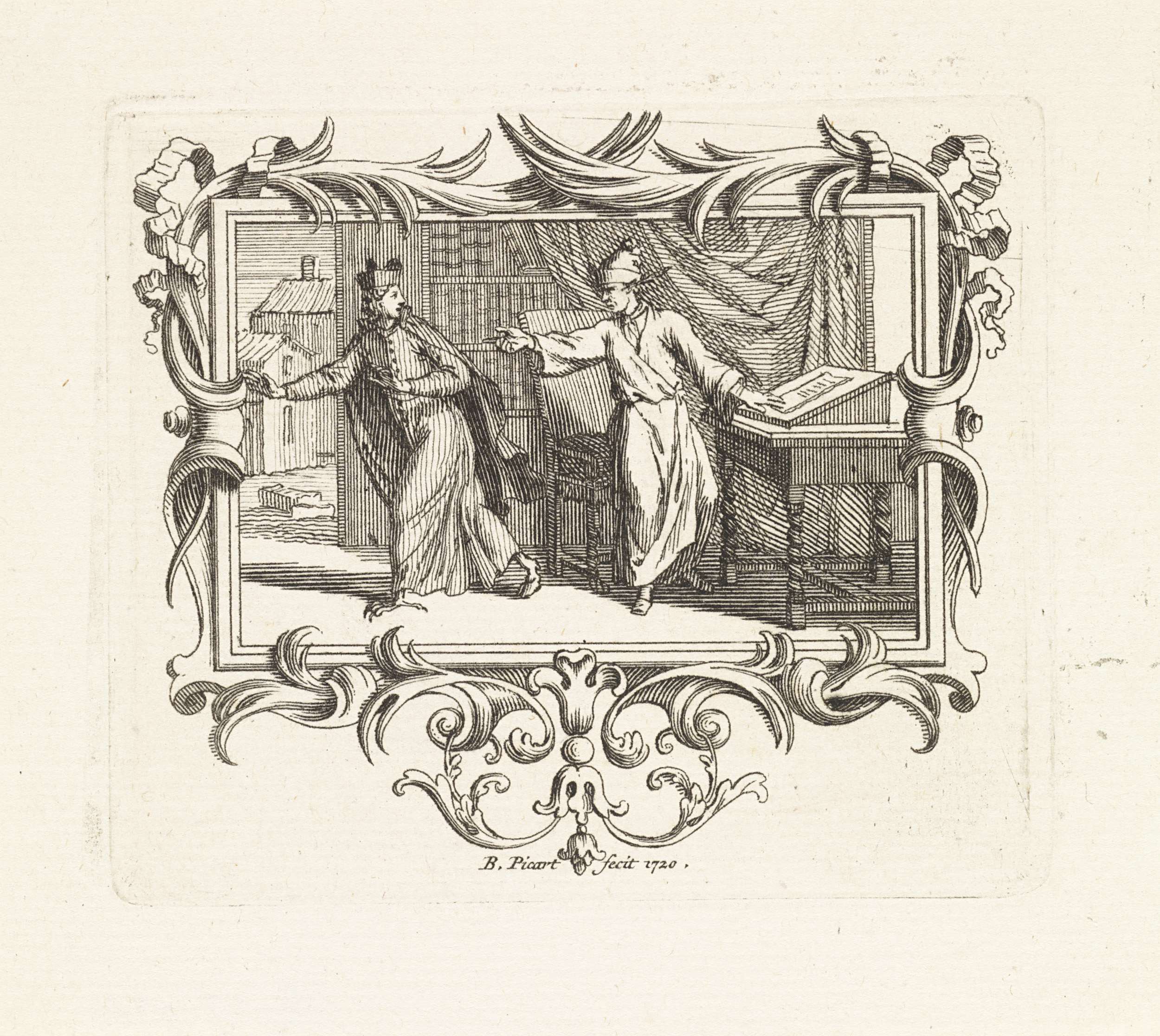 Een man achter een lessenaar wijst op een geestelijke, die van hem wegvlucht. De voorstelling is gevat in een ornamenteel kader.