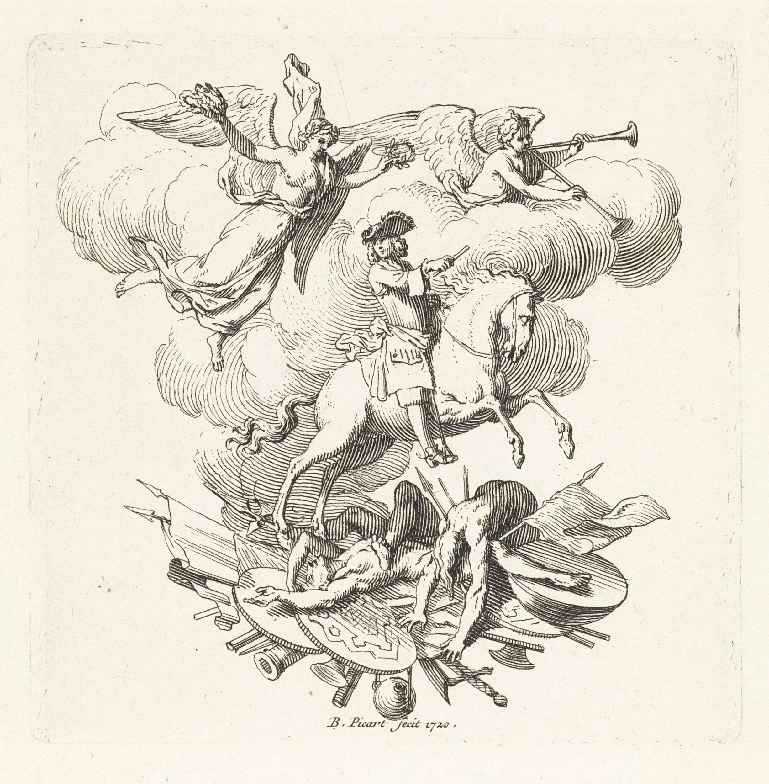 Victoria kroont een veldheer met een lauwerkrans. Op de wolken de personificatie van Faam. Op de grond wapentuig en lijken.