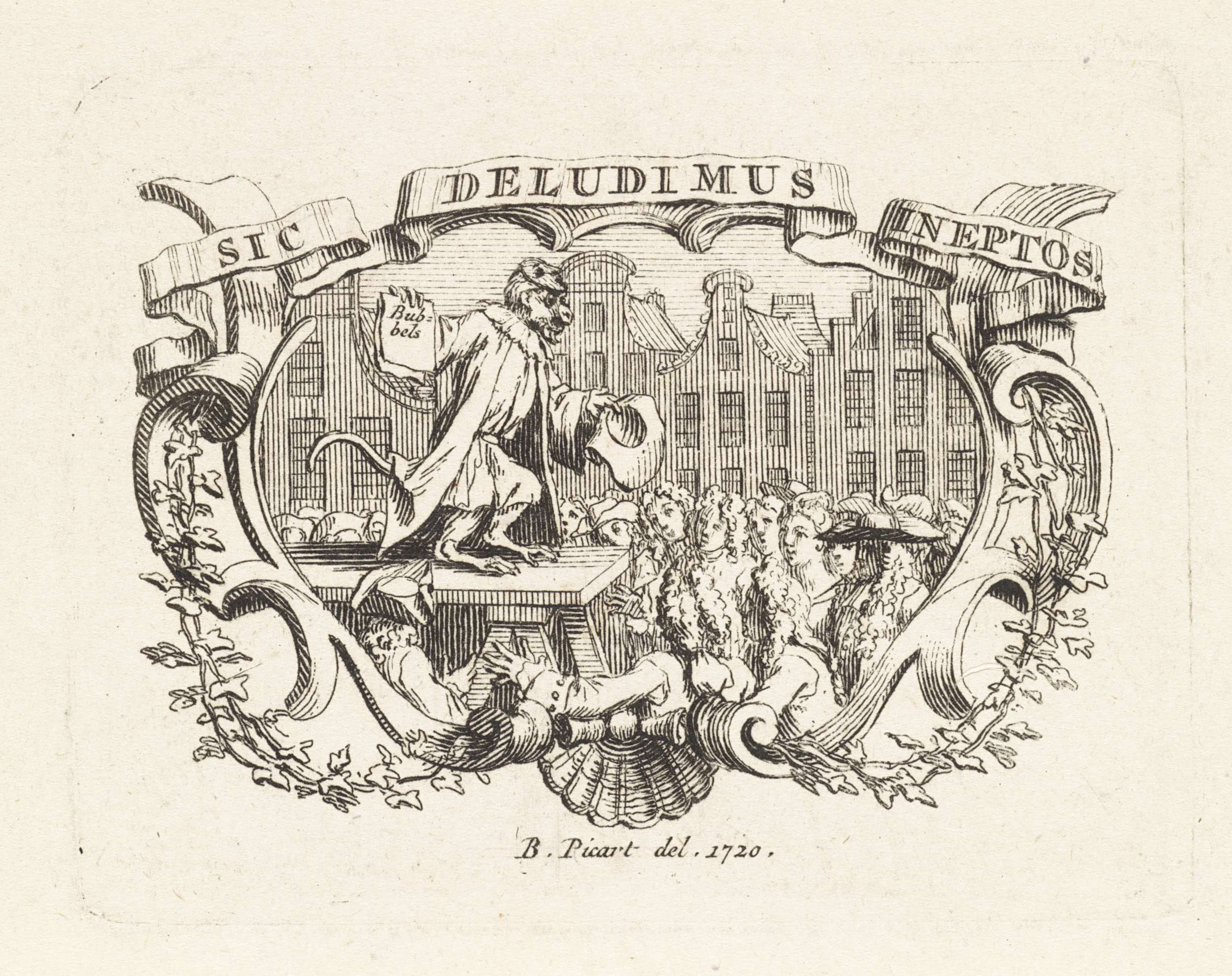 Een aangeklede aap toont een blad papier aan zijn publiek. Rond het podium staat een menigte. Bovenaan in de ornamentele lijst het devies: Sic Deludimus Neptos.