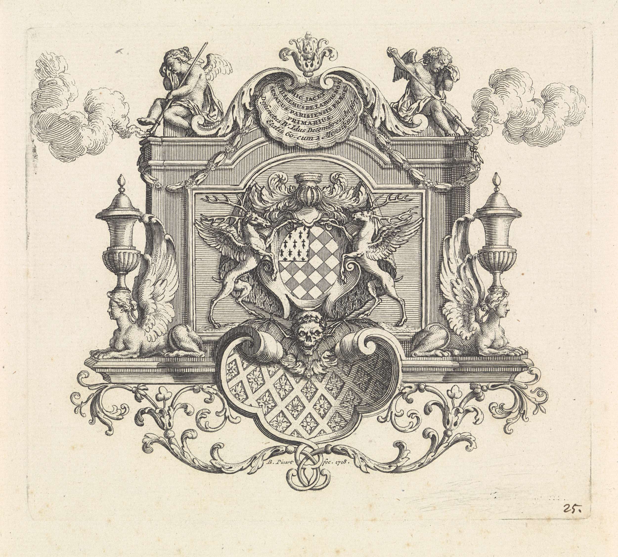 Een gedenkteken voor Guillaume de Lamoignon met in het midden zijn wapenschild. Bovenop het gedenkteken zitten twee treurende putti met uitgedoofde fakkels.