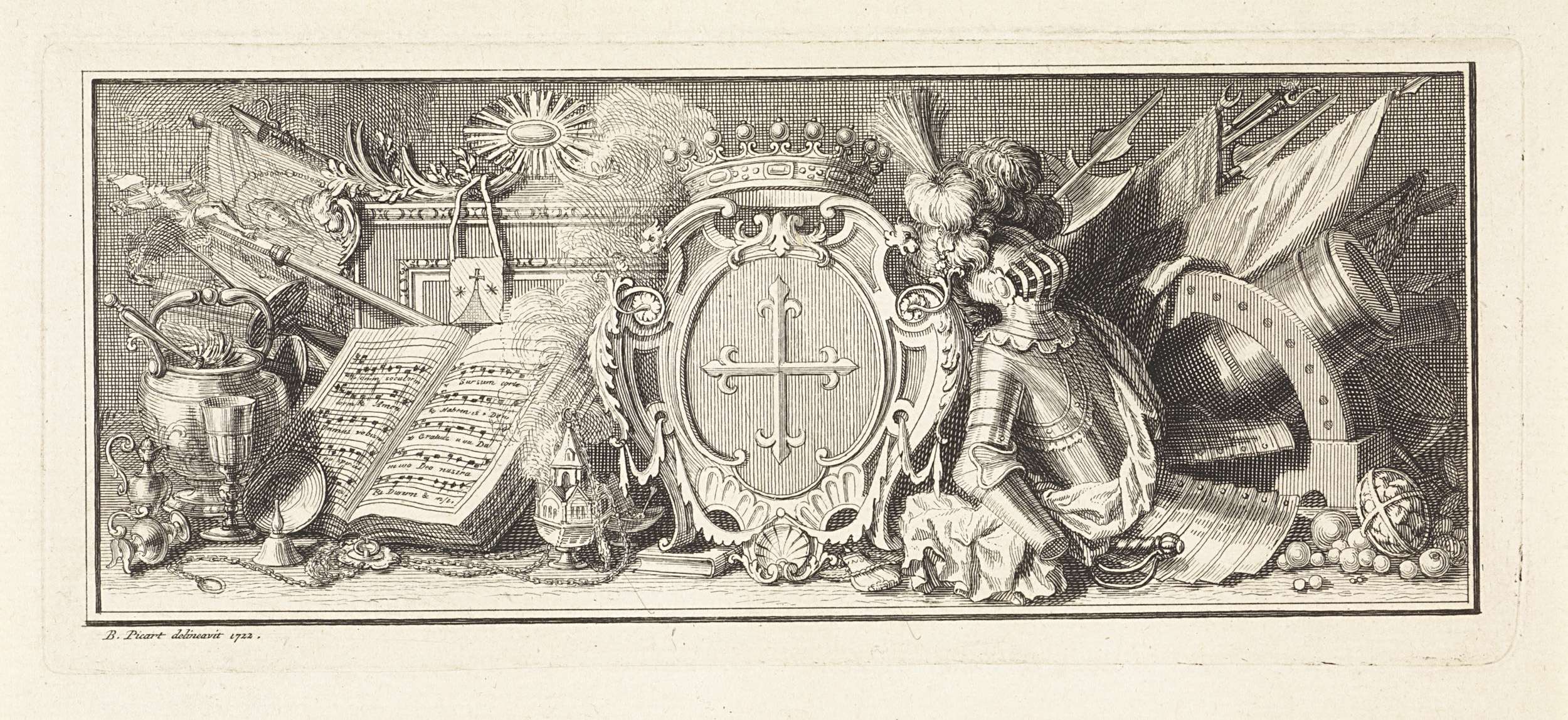 Gekroond wapenschild met een kruis. Links kerkelijke attributen, onder andere een wijwatervat, liedboek en wierookvat. Rechts wapentuig.