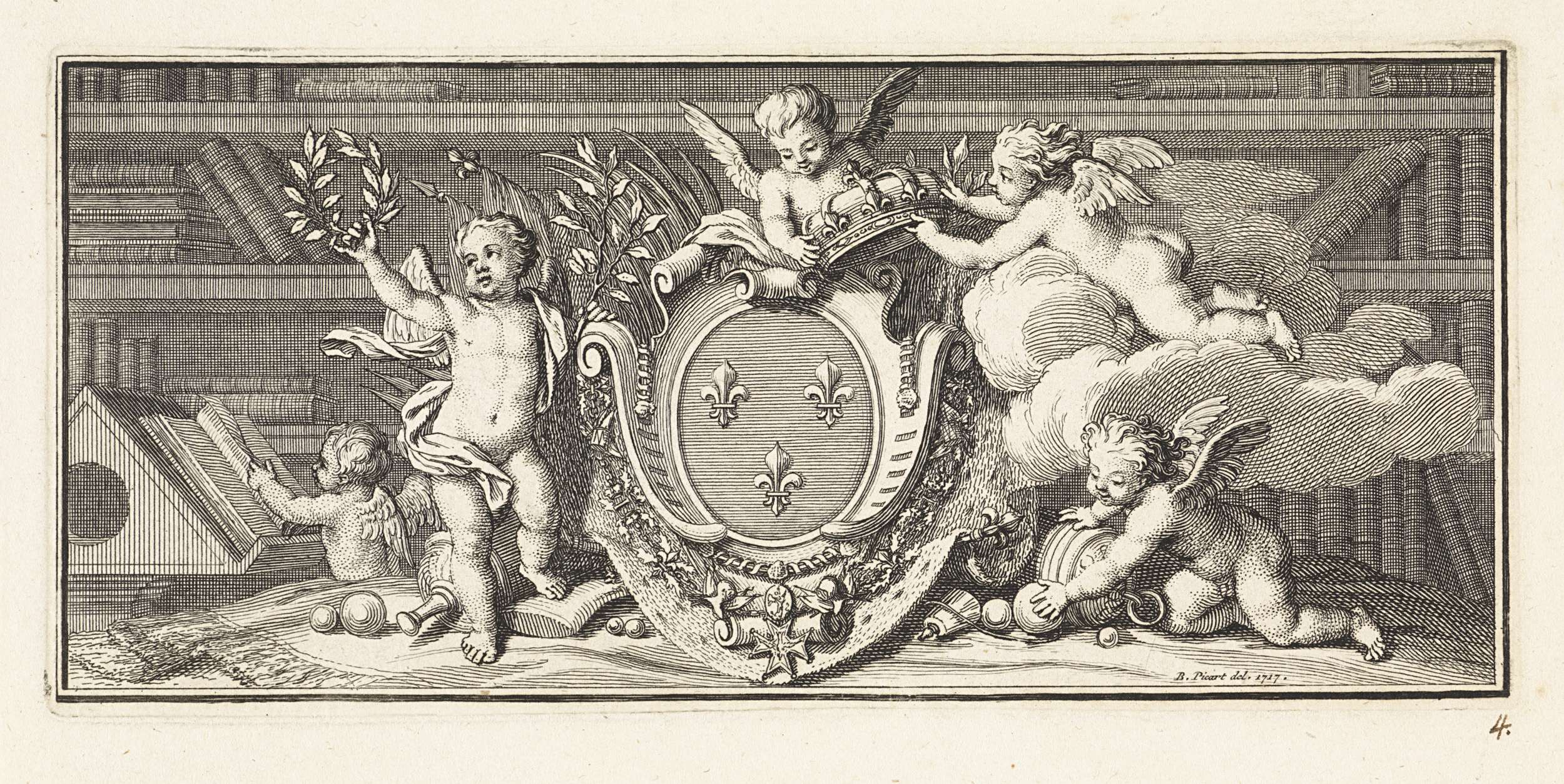 Het wapenschild van Lodewijk XIV, koning van Frankrijk, met midden onder het ordeteken van de Orde van de Heilige Geest, wordt door putti gekroond. Op de achtergrond boekenplanken.