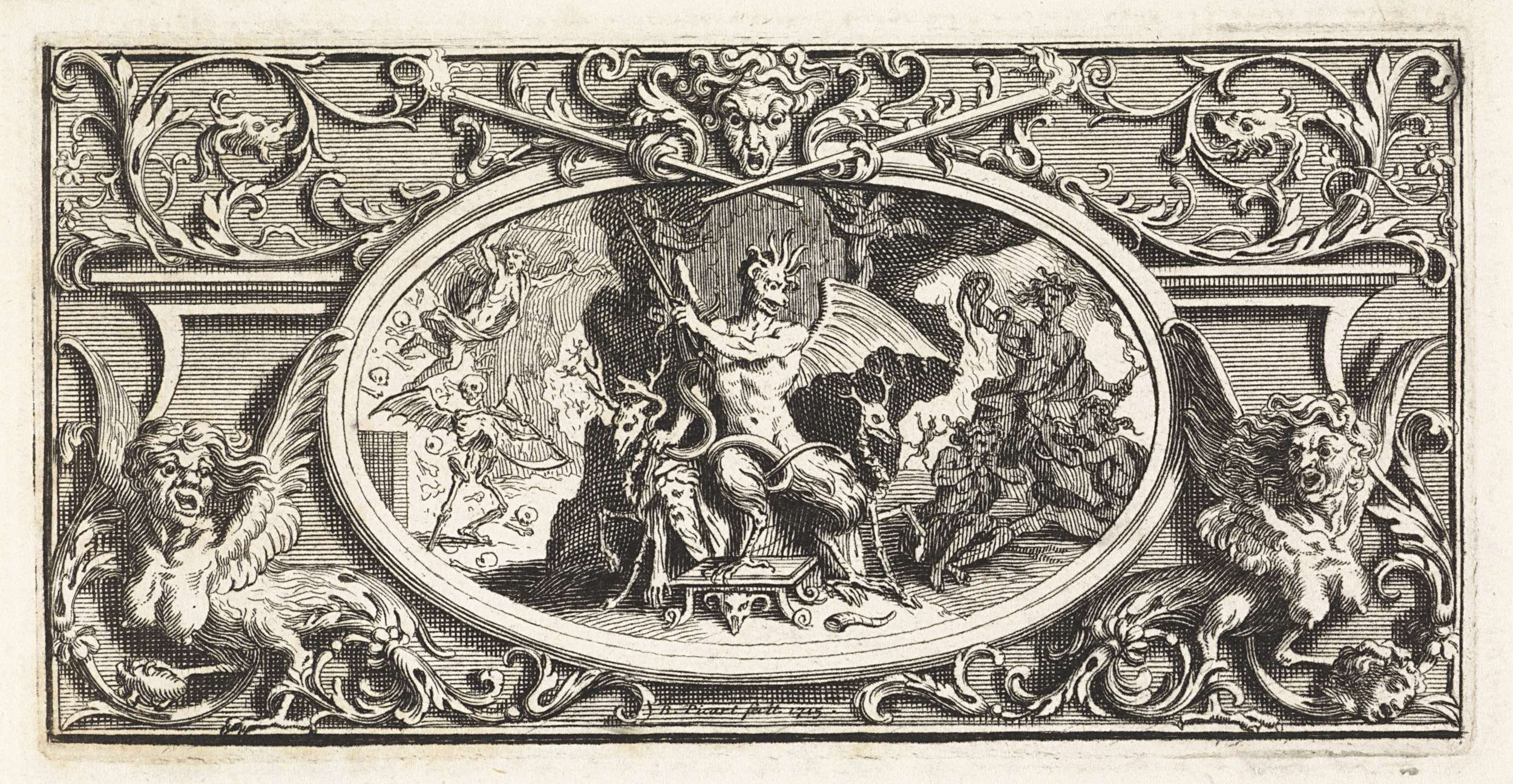 Duivels, demonen en de Dood in de onderwereld. In de onderhoeken van de ornamentele omlijsting harpijen.