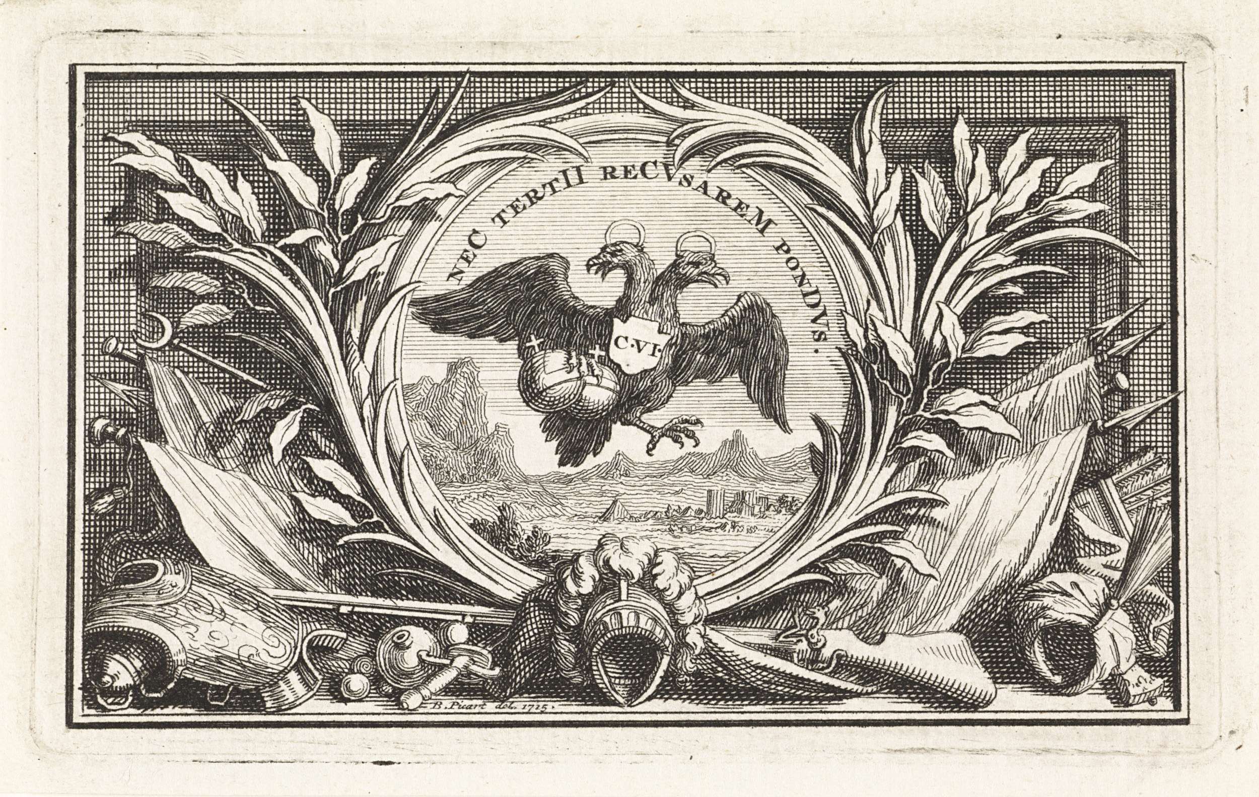 In het midden de dubbelkoppige adelaar van het Heilige Roomse Rijk met twee rijksappels en een verwijzing naar Duits keizer Karel VI op de borst (C.VI). In de omlijsting wapentuig en Ottomaanse trofeëen.