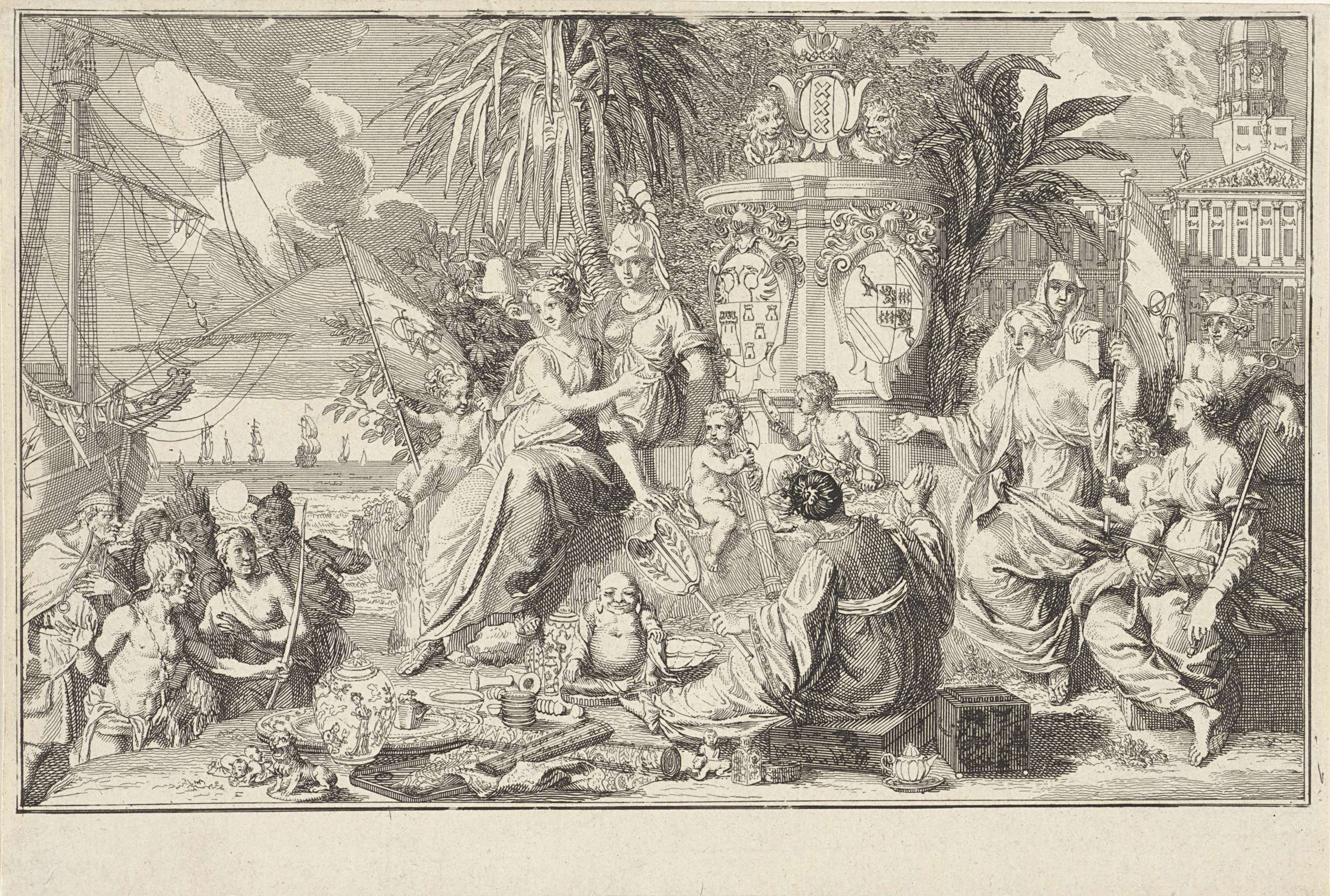 De personificaties van de West-Indische en Oost-Indische Compagnie, ieder met een vlag van de compagnie in de hand, wijzen op de wapenschilden van Aegidius van den Bempden en Jan Lieve Geelvinck, bewindhebbers van de handelscompagnieën en burgemeesters van Amsterdam. Rechts het Stadhuis van Amsterdam en de personificaties van Geloof, Mercurius als god van de handel ...