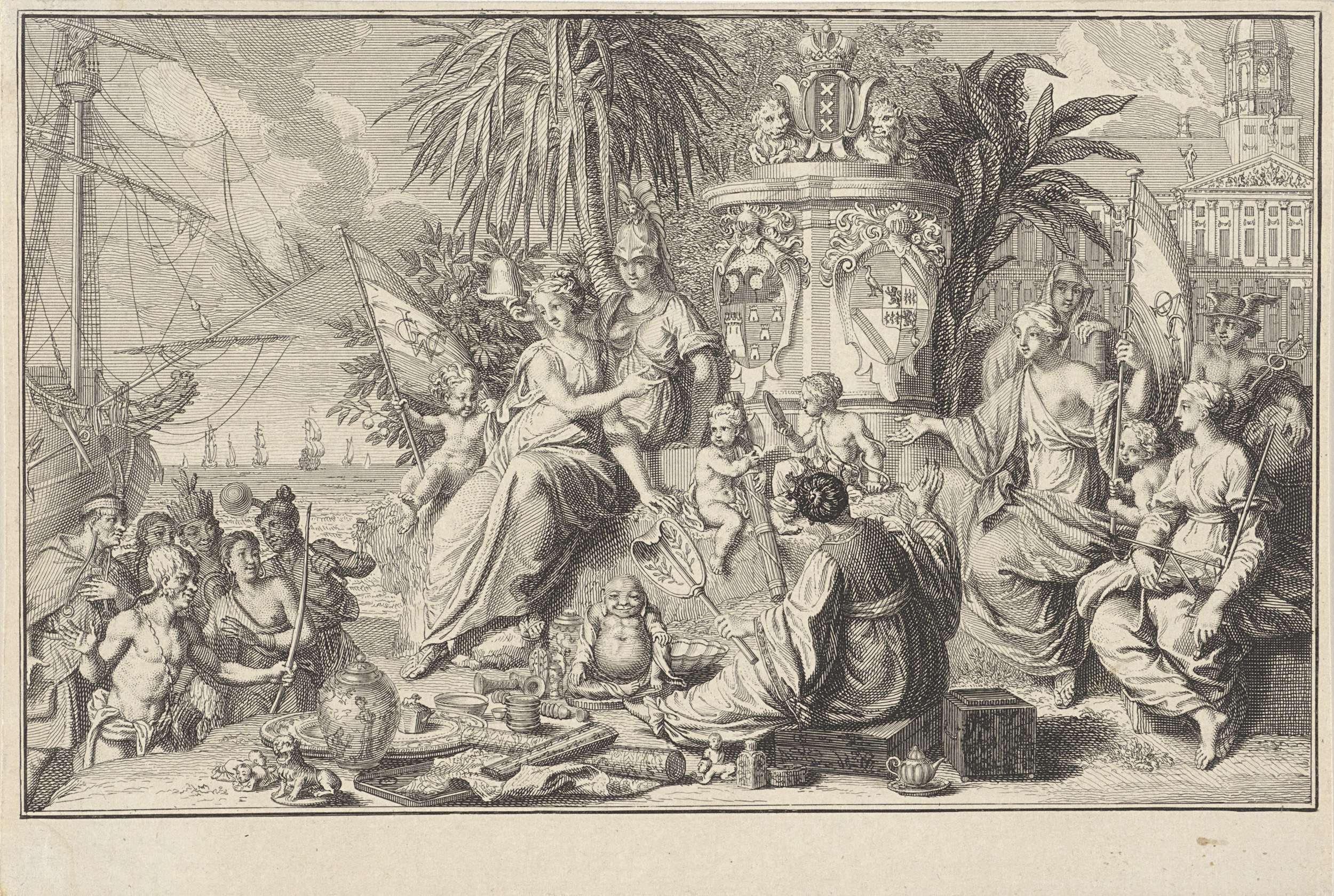 De personificaties van de West-Indische en Oost-Indische Compagnie, ieder met een vlag van de compagnie in de hand, wijzen op de wapenschilden van Aegidius van den Bempden en Jan Lieve Geelvinck, bewindhebbers van de handelscompagnieën en burgemeesters van Amsterdam. Rechts het Stadhuis van Amsterdam en de personificaties van Geloof, Mercurius als god van de handel ...