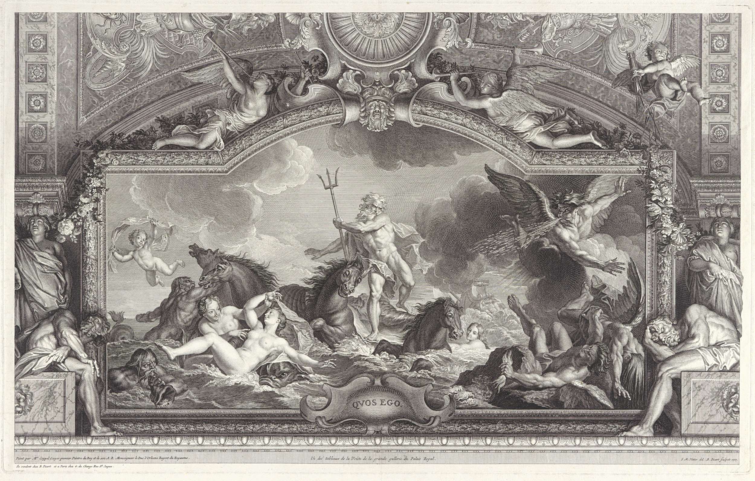 De vertoornde Neptunus, staande temidden van de golven in zijn wagen, bedreigt met zijn drietand de winden. Op de achtergrond een zinkend Trojaans schip. De voorstelling is gevat in een ornamentele lijst bekroond door twee figuren van de Faam. Rechtsboven Amor, die zijn pijlen uit zijn koker strooit.