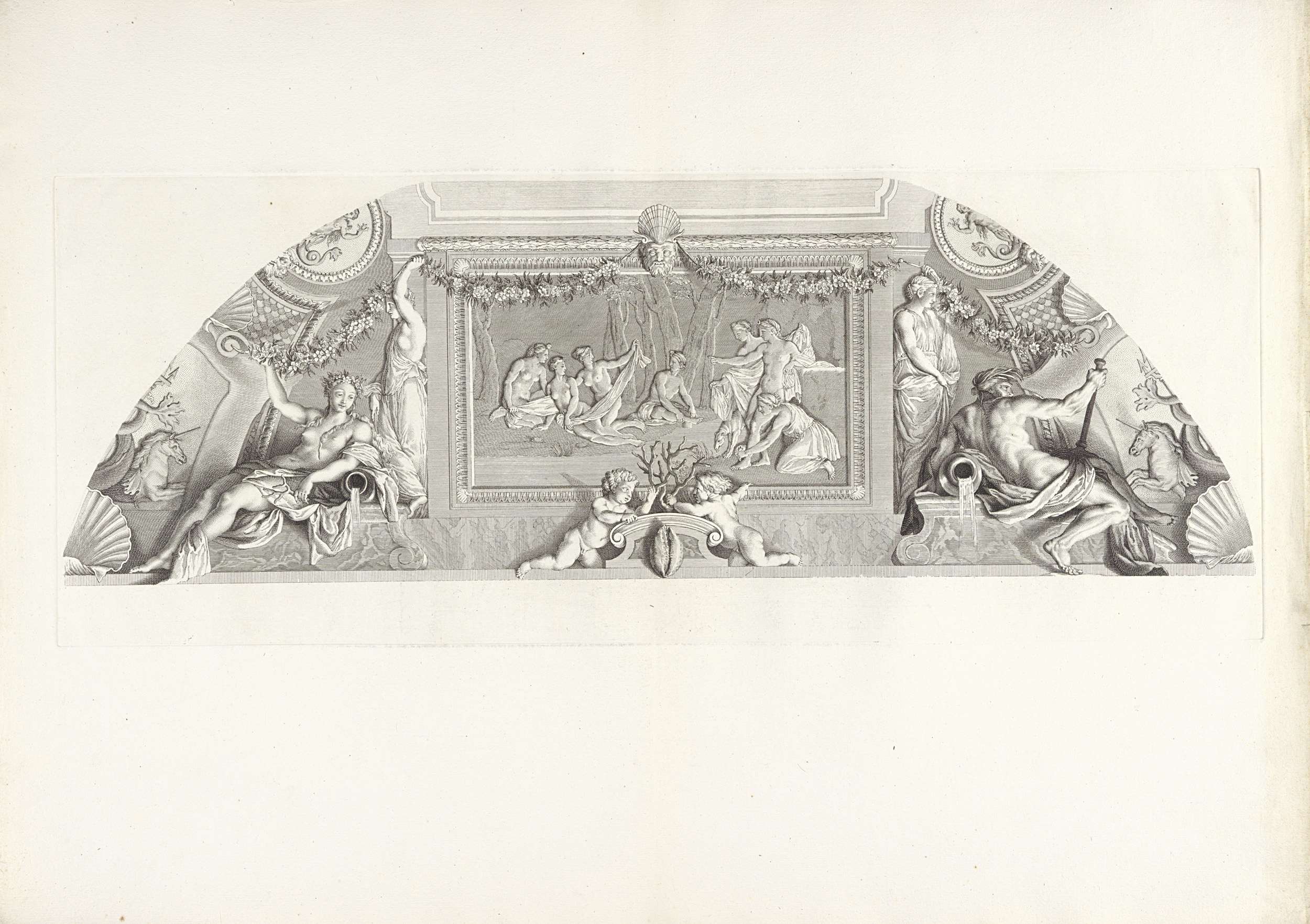 Grisaille, met de voorstelling van de godin Diana, die de zwangerschap van de nimf Callisto ontdekt, in de hoek van het plafond van de Chambre des Bains in het Hôtel Lambert. De voorstelling van Diana en callisto wordt geflankeerd door een stroomgodin en een stroomgod, ieder met een waterkan. Midden onder twee putti met koraal. ...