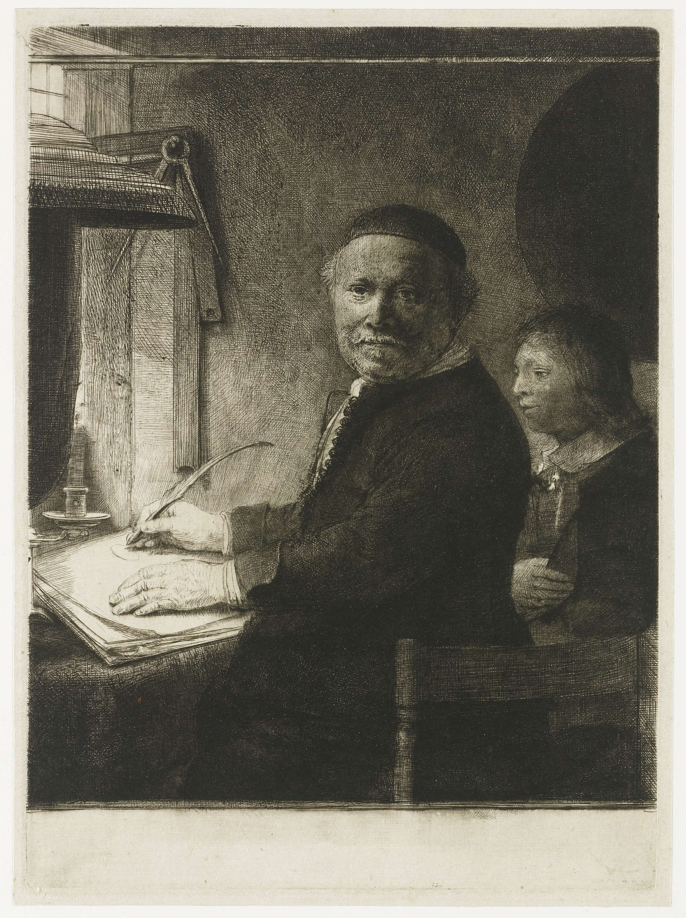 Het is geen toeval dat Coppenol een vel papier en een pen vasthoudt; hij was immers schrijfmeester. Enige ijdelheid was hem niet vreemd. Hij vroeg dichters om lofdichten op zijn gave, die hij dan in schoonschrift onder zijn portret zette. Rembrandt etste hem tweemaal; de eerste versie met zijn kleinzoon Antonius was vermoedelijk niet helemaal ...
