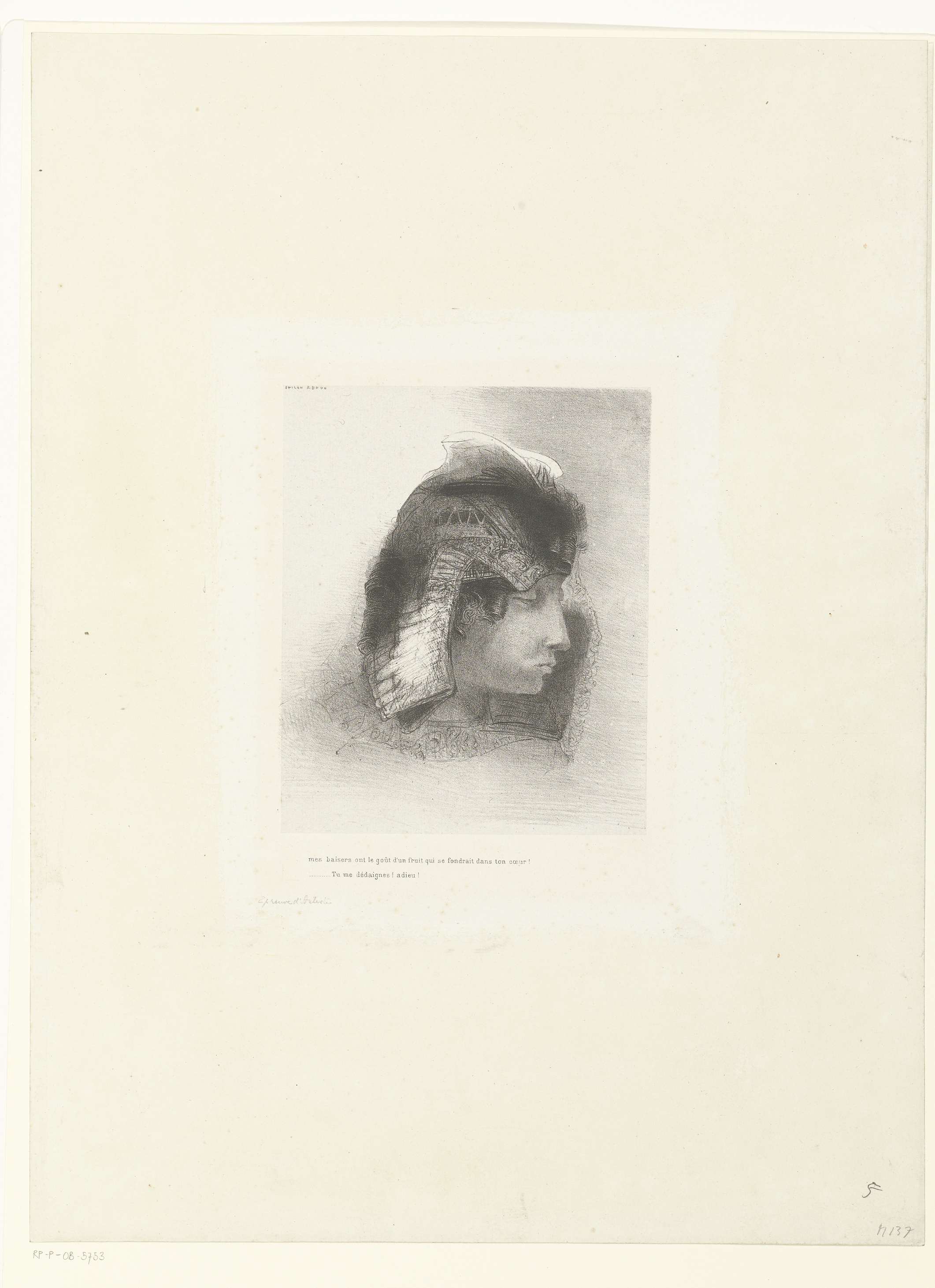 Kop van een man met een hoofddeksel. Onder de afbeelding de tekst: Mijn kussen hebben de smaak van een vrucht die in je hart zou smelten..... Je bespot me! adieu!. Vierde prent van vierentwintig, uit de derde serie illustraties voor Gustave Flauberts De verzoeking van de heilige Antonius.