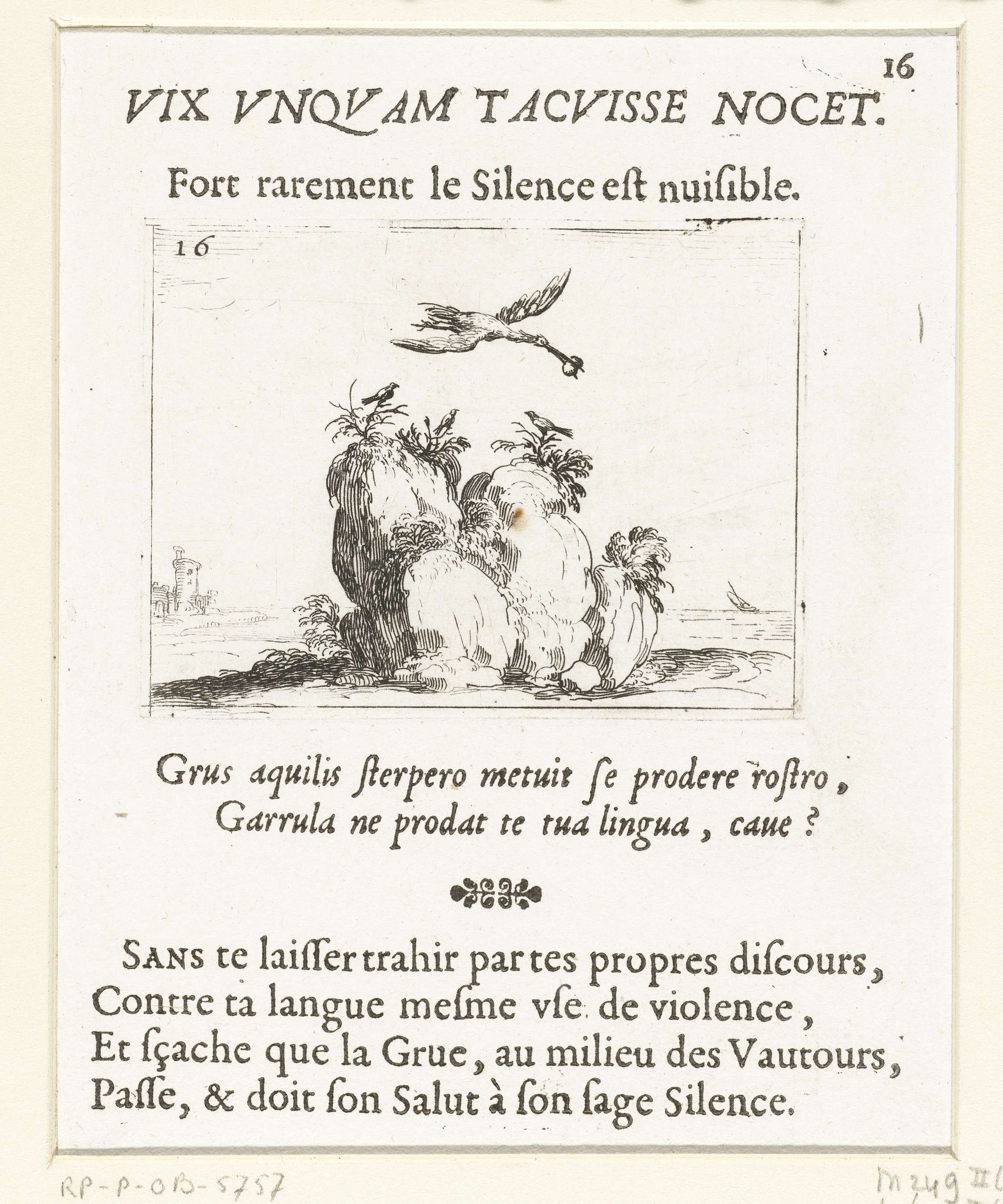 Voorstelling van een kraanvogel met een steen in de snavel, die over een rots vliegt waarop drie kleine vogels zitten. Boven en onder deze prent Latijnse en Franse teksten in boekdruk. Dit blad is onderdeel van de embleemserie 'Kloosterleven in emblemen'. De tweede staat van deze serie behelst naast een geïllustreerde titelpagina en 26 emblemen ...