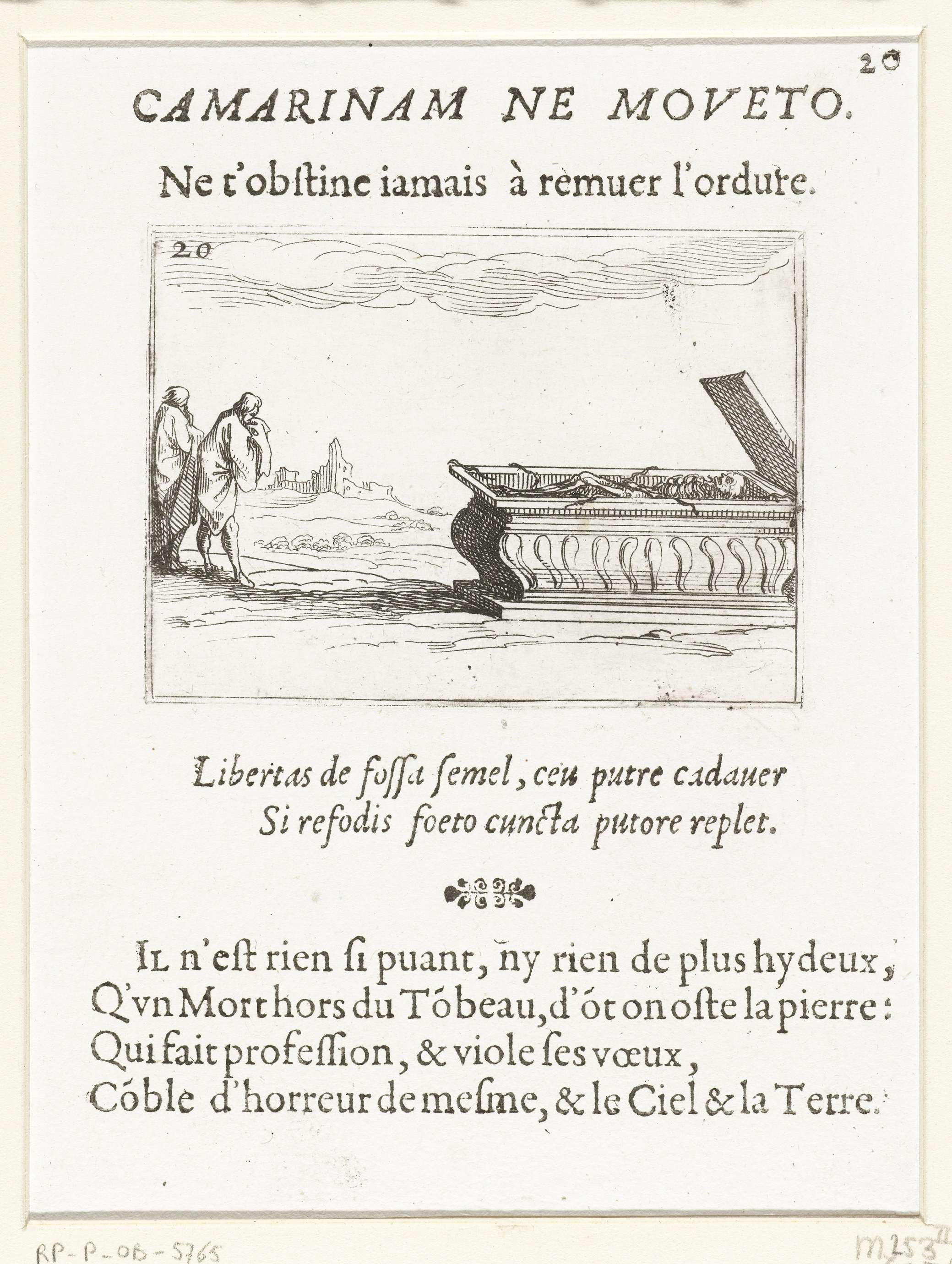 Voorstelling van een skelet in een geopende sarcofaag; twee mannen staan ernaast. Boven en onder deze prent Latijnse en Franse teksten in boekdruk. Dit blad is onderdeel van de embleemserie 'Kloosterleven in emblemen'. De tweede staat van deze serie behelst naast een geïllustreerde titelpagina en 26 emblemen nog een titelpagina en een blad met opdracht, ...