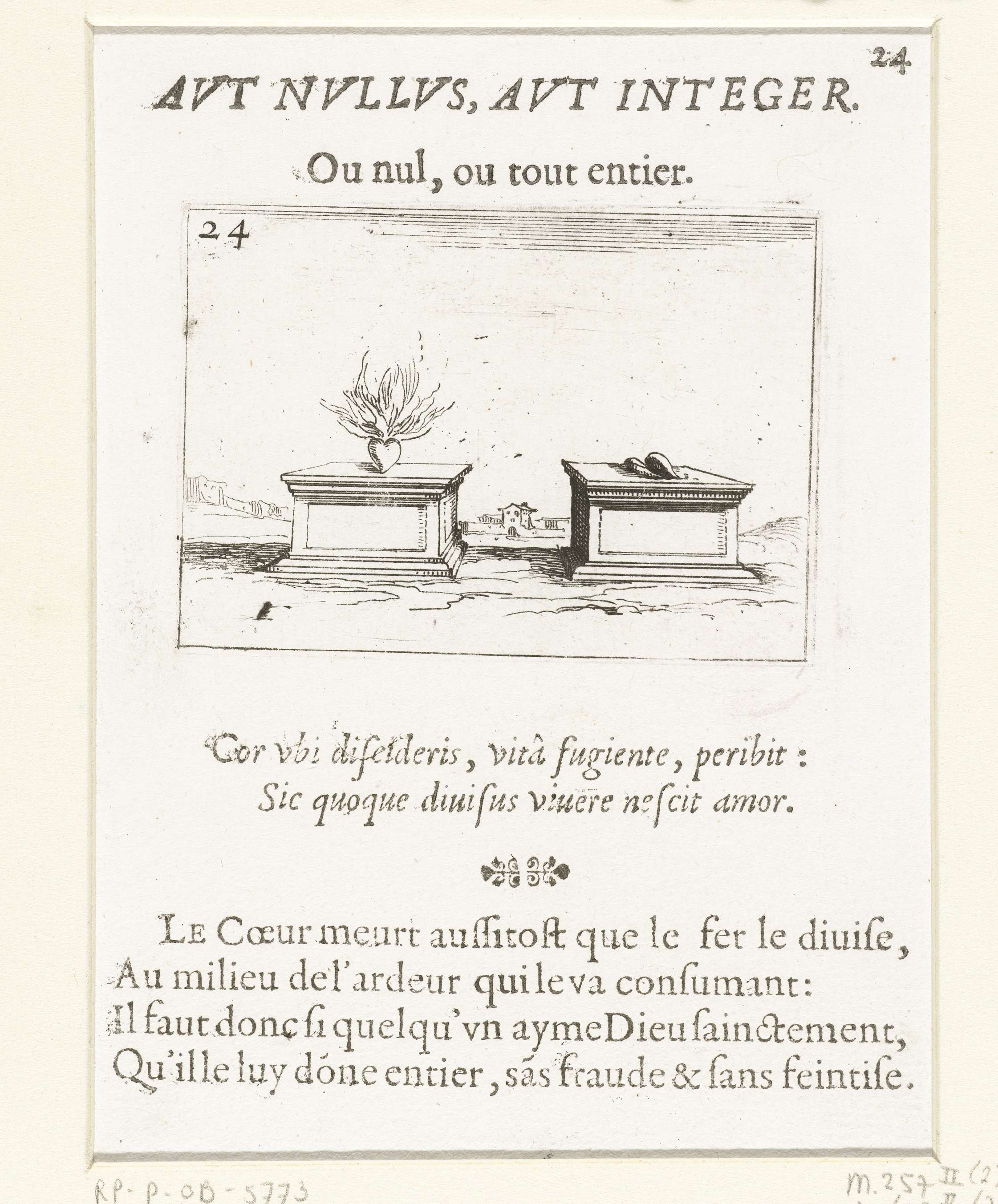 Voorstelling van twee altaren; op het linker altaar staat een brandend hart, op het rechter altaar ligt een gespleten hart. Boven en onder deze prent Latijnse en Franse teksten in boekdruk. Dit blad is onderdeel van de embleemserie 'Kloosterleven in emblemen'. De tweede staat van deze serie behelst naast een geïllustreerde titelpagina en 26 emblemen ...