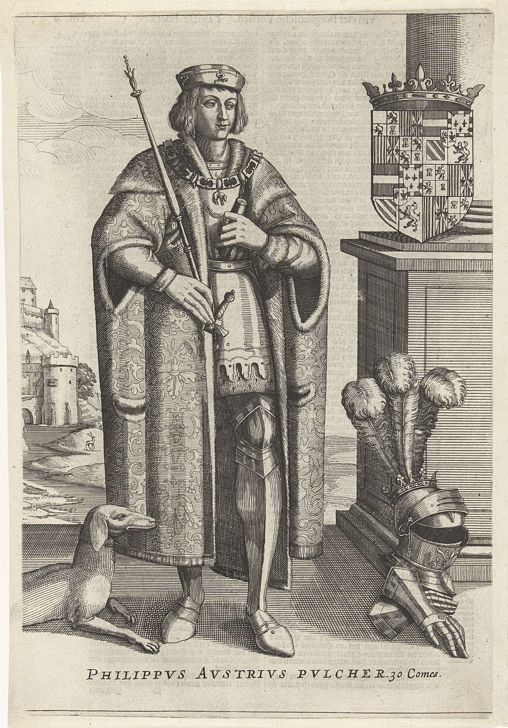 Portret van Filips de Schone, hertog van Bourgondië. Staande, ten voeten uit. In zijn rechterhand een scepter. Een hond ligt aan zijn voeten. Naast hem een helm en zijn wapenschild.