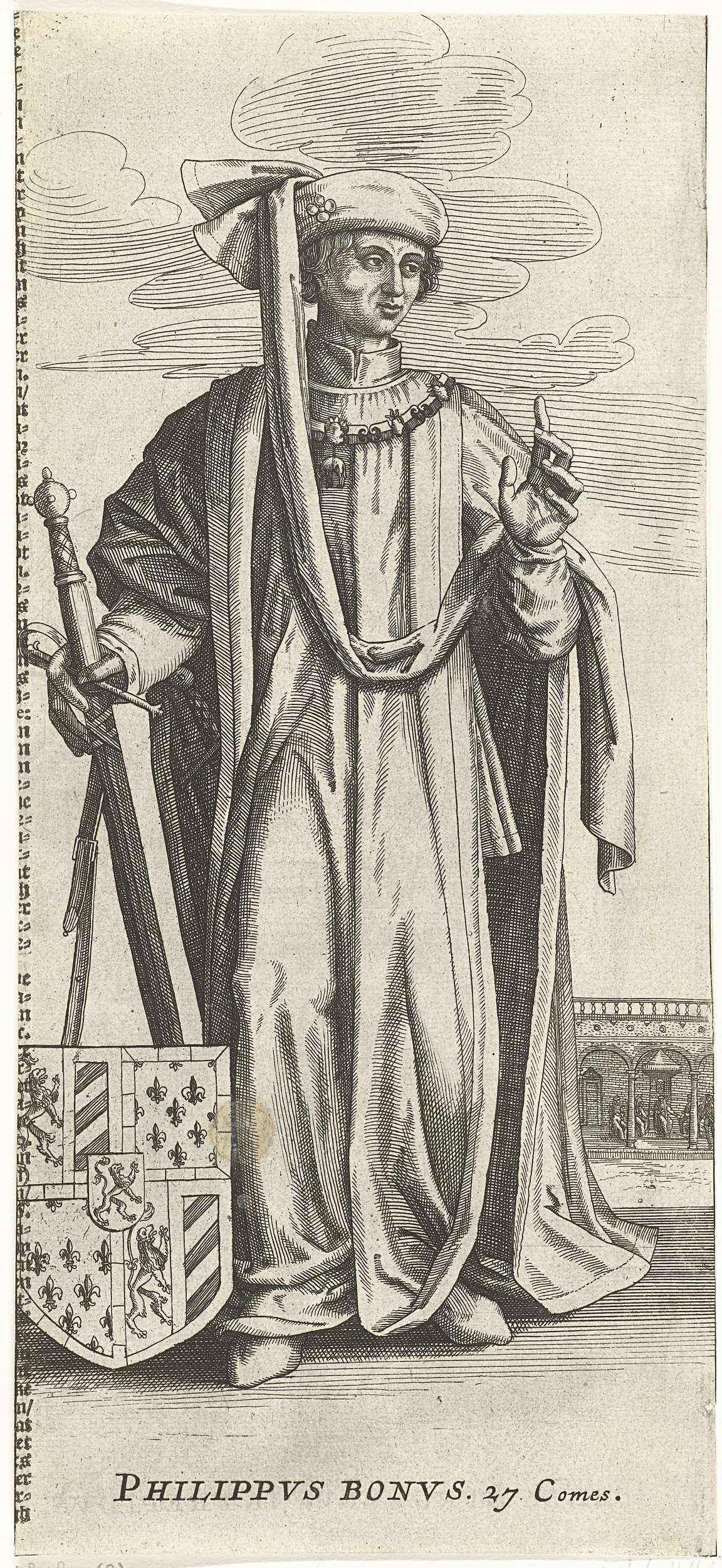 Portret van Filips de Goede, hertog van Bourgondië. Staande, ten voeten uit. In zijn rechterhand het rijkszwaard en zijn wapenschild.