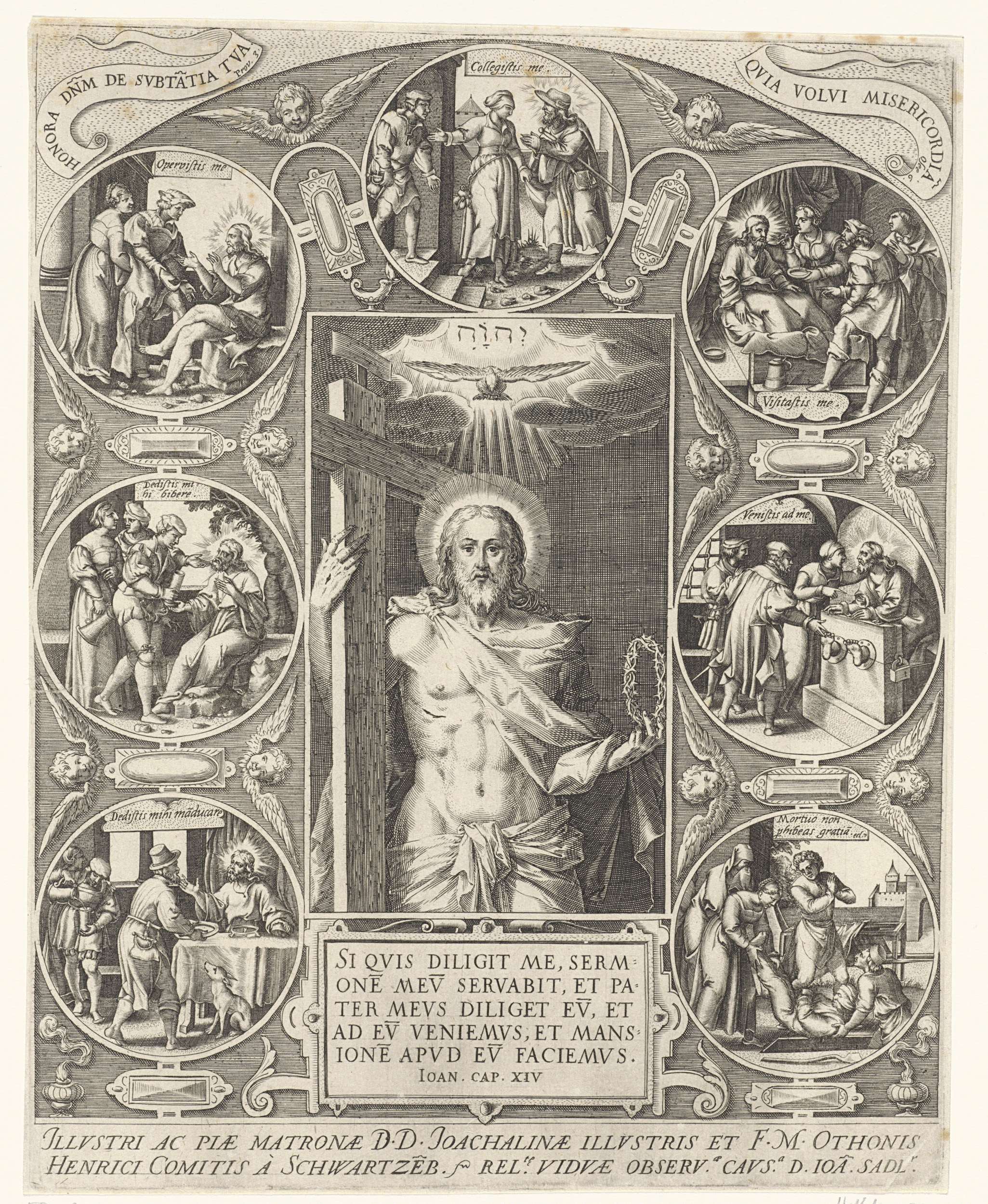 Christus, ten halven lijve, staand, met kruis en doornenkroon. Boven zijn hoofd de Heilige Geest (als duif) en God de Vader (tetragram). In kader, omgeven door zeven tondo's met de uitvoering van zeven werken van barmhartigheid door de mens, met Christus in de rol van behoeftige.