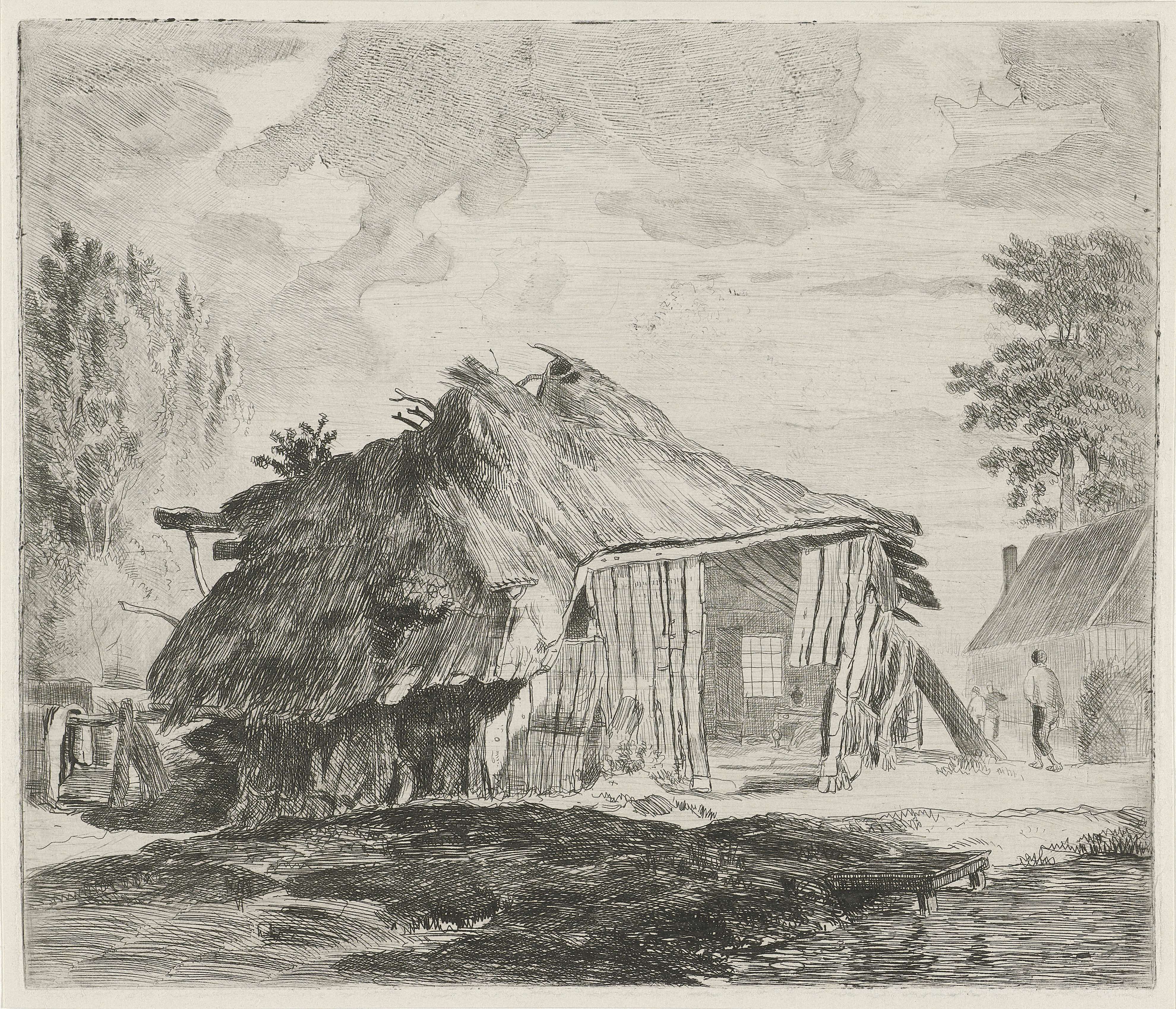Schuur in een landschap aan water gelegen. Aan de rechterzijde drie figuren.