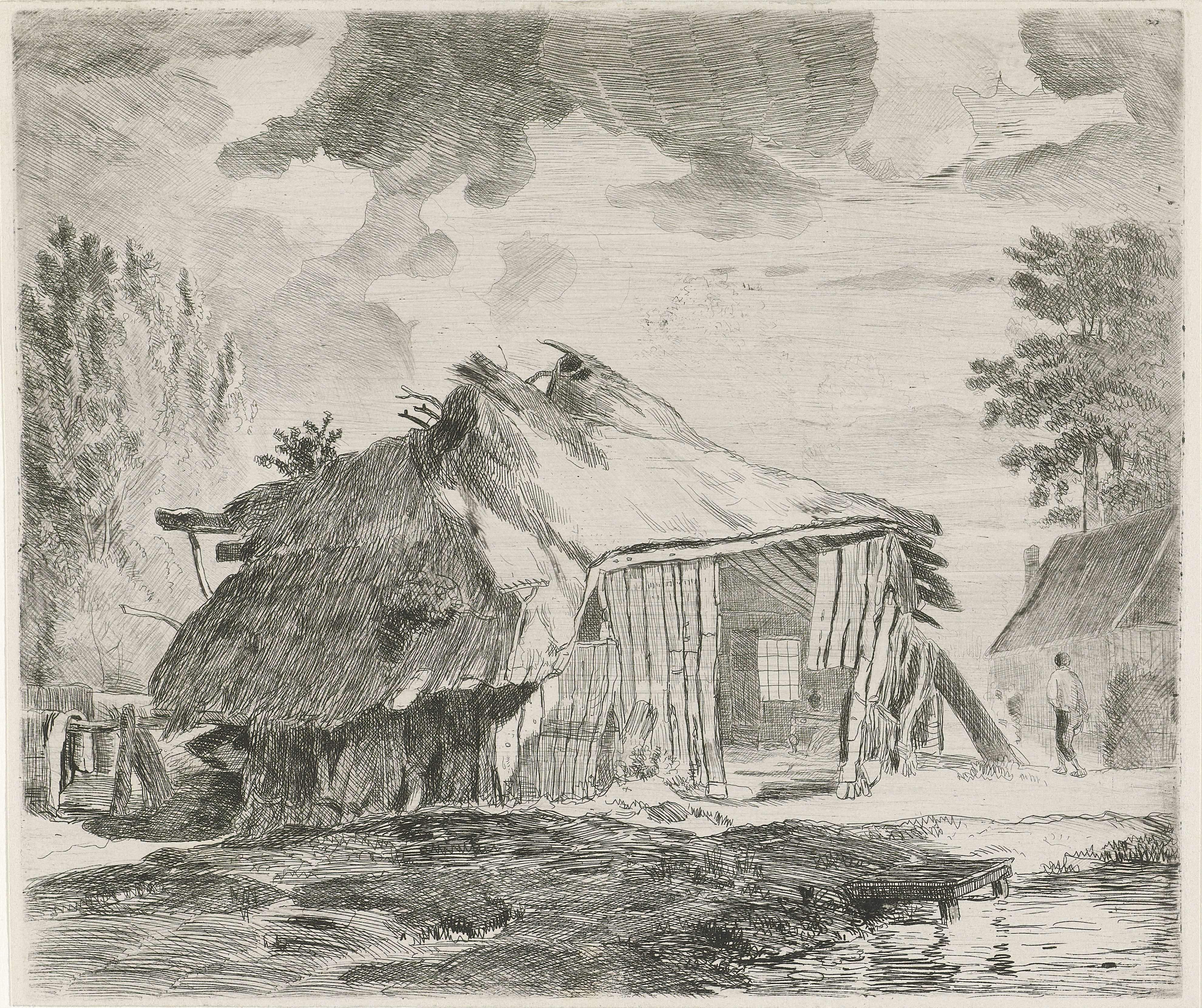 Schuur in een landschap aan water gelegen. Aan de rechterzijde drie figuren.
