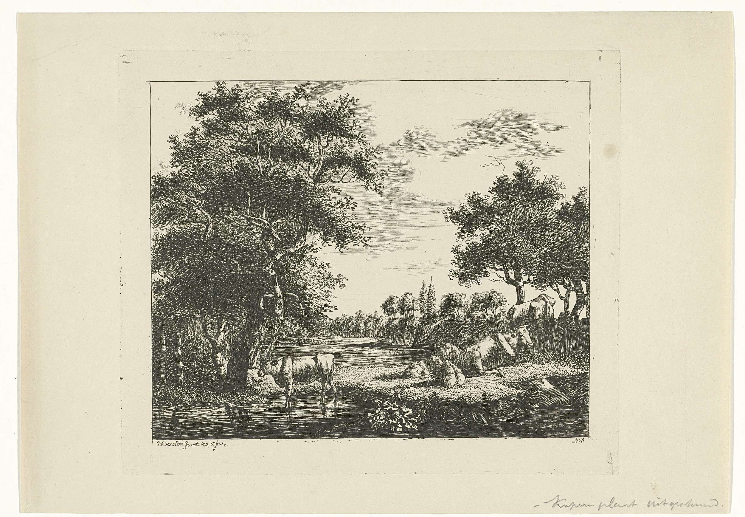 Een landschap met koeien en schapen aan de oever van een meertje.