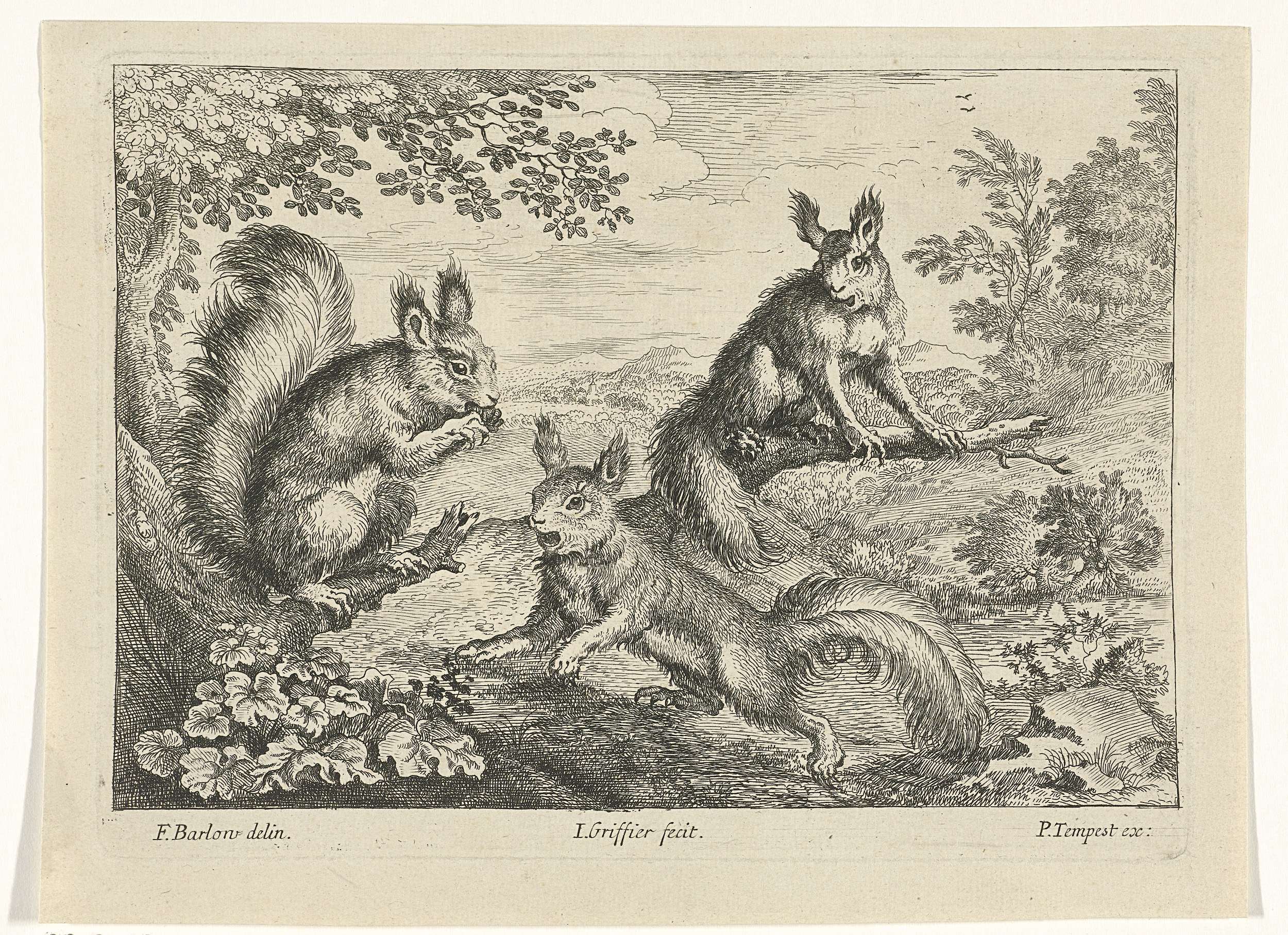 Drie eekhoorns in een bosrijk landschap. Deze prent maakt deel uit van een serie van tien prenten met verschillende dieren.