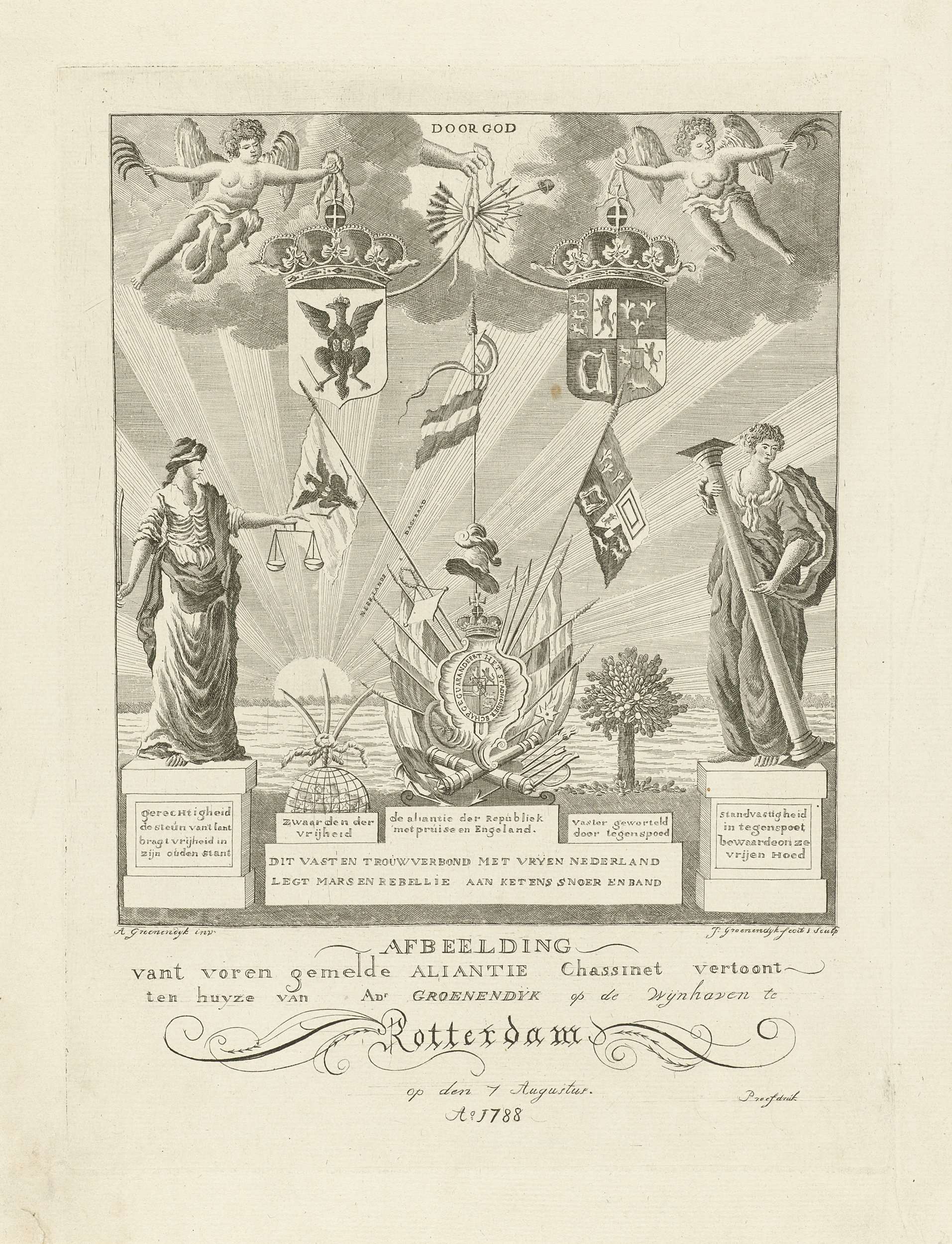 Allegorie op de Triple Alliantie tussen de Republiek der Zeven Verenigde Provincieën, Pruisen en het Verenigd Koninkrijk, 1788