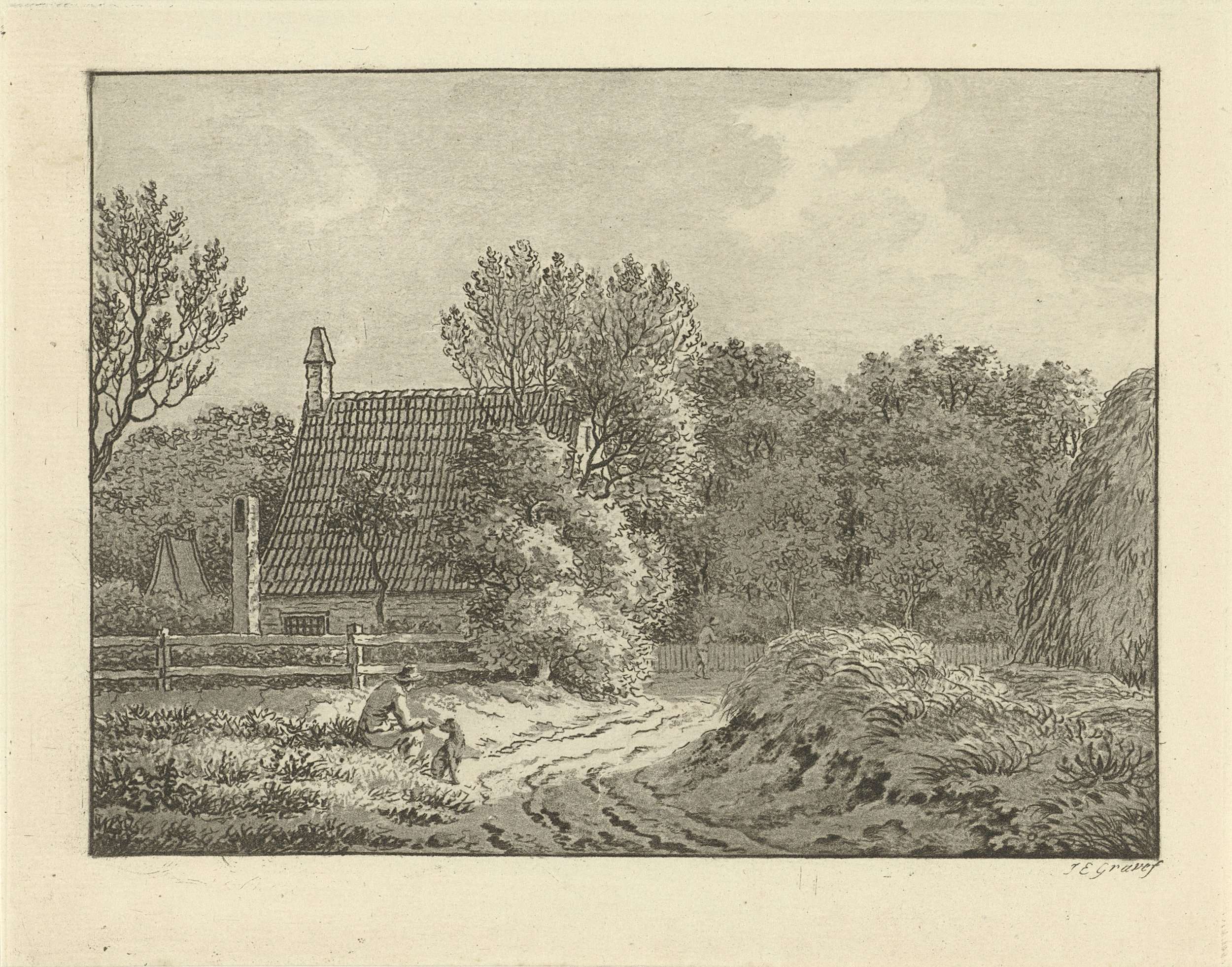 Een landschap te Bloemendaal met enkele wandelaars op een weg. Op de voorgrond een zit een man naast de weg met zijn hond. Op de achtergrond een huis.